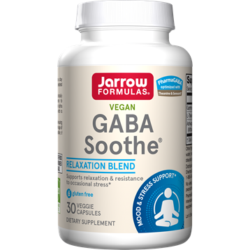 "Jarrow Formulas GABA Soothe includes clinically studied ingredients that support resistance to occasional stress (Ashwagandha extract) and alpha brain wave formation (GABA and Theanine), which is associated with relaxation." Dietary Considerations Wheat Free Dairy/ Milk Free Gluten Free Vegetarian Soy Free Vegan Egg Free Shellfish Free Non-GMO Fish Free Tree Nut Free Peanut Free NSF Certified Suggested Use Take 1 capsule per day with water or juice on an empty stomach or as directed by your qualified healthcare professional. Serving Size: 1 VCap Servings Per Container: 30 Amount Per Serving Gamma-aminobutyric Acid (GABA) (PharmaGABA) 100 mg Theanine 100 mg Ashwagandha Extract (Withania somnifera) (Leaf & Root) (Sensoril ) 225 mg Other Ingredients Capsule (hydroxypropylmethylcellulose, water), maltodextrin, microcrystalline cellulose, magnesium stearate (vegetable source), silicon dioxide Warnings Keep out of the reach of children.Store in a cool, dry place. No wheat, no gluten, no soybeans, no dairy, no egg, no fish/shellfish, no peanuts/tree nuts. Suitable for vegetarians/vegans.If you have a medical condition, are pregnant, lactating, trying to conceive, under the age of 18, or taking medications, consult your healthcare professional before using this product.