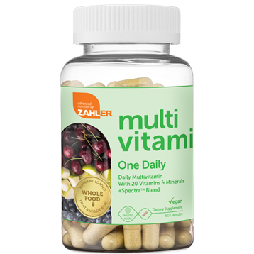 Zahler Multivitamin One Daily is an exclusive and innovative multivitamin formula based on cutting-edge research, sound scientific discoveries and the latest knowledge in the field of supplemental nutrition. This revolutionary formula is made with superior ingredients from superior sources for maximum absorption and benefit. In addition to having all of the qualities of a multivitamin, also included is a nutrient-loaded, clinically studied and published, whole-food fruit & veggie base.  Multivitamin One Daily contains:  Superior ingredients from superior sources Formulated with body-ready (methylated, phosphorylated, chelated & coenzyme) forms of vitamins and minerals for maximum absorption  Whole-food fruit & veggie base Spectra is a clinically studied nutrient-loaded blend which fills in the gaps of your daily nutrition  21 Vitamins and Minerals + Spectra all in a one-a-day capsule serving  Dietary Considerations Dairy/ Milk Free Gluten Free Kosher Soy Free Vegan Non-GMO  Serving Size:1 Capsule  Servings Per Container:60  Amount Per Serving% Daily Value Vitamin A (as Beta Carotene and Retinyl Palmitate)900 mcg100% Vitamin C (from PUREWAY-C Ascorbic Acid)45 mg50% Vitamin D3 (As Cholecalciferol) (From Lichen) (Vegan)50 mcg250% Vitamin E (as D-Alpha Tocopheryl Succinate)7.5 mg50% Vitamin K (as Menaquinone-7)90 mcg75% Thiamin (as Thiamine HCl)1.2 mg100% Riboflavin (as Riboflavin-5-Phosphate Sodium)1.3 mg100% Niacin (as Inositol Hexanicotinate)16 mg100% Vitamin B6 (as Pyridoxal-5-Phosphate)1.7 mg100% Folate (as L -5- Methyltetrahydrofolate Calcium) DFE400 mcg100% Vitamin B12 (as Methylcobalamin)24 mcg1000% Iron (as Ferrous Bisglycinate Chelate) (Ferrochel)4.5 mg25% Iodine (as Potassium Iodide)75 mcg50% Magnesium (as Simag Magnesium Oxide)42 mg10% Zinc (as Zinc Arginate Chelate) (TRAACS)11 mg100% Selenium (as Methylselenocysteine)55 mcg100% Copper (as Copper Bisglycinate Chelate) (TRAACS)0.45 mg50% Manganese (as Manganese Bisglycinate Chelate) (TRAACS)1.15 mg50% Chromium (as Crominex 3+ Chromium stabilized with Capros Amla Fruit Extract and PrimaVie Shilajit Gum Resin Extract, Chromium Chloride Hexahydrate)35 mcg100% Molybdenum (as Molybdenum Glycinate Chelate)22.5 mcg50%  Spectra Blend:100 mg Coffee Fruit Extract Green Tea Leaf Extract Broccoli Sprout Onion Bulb Extract Apple Fruit Extract Quercetin Acerola Fruit Extract Tomato Fruit Broccoli Floret and Stems Cabbage Palm Fruit Turmeric Root Garlic Bulb Basil Leaf Oregano Leaf Cassia Bark Carrot Root European Elder Fruit Mangosteen Fruit Camu Camu Fruit Black Currant Fruit Extract Blueberry Fruit Extract Raspberry Fruit Blackberry Fruit Spinach Leaf Aronia prunifolia Fruit Collards Leaf Sweet Cherry Fruit Bilberry Fruit Extract Brassica olearacea Var.gemmifera Sprout  Other Ingredients: Hypromellose (Capsule), Organic Rice Hull Concentrate Take 1 capsule daily with food, or as directed by a healthcare practitioner. Accidental overdose of iron-containing products is a leading cause of fatal poisoning in children under 6. Keep this product out of reach of children. In case of accidental overdose, call a doctor or poison control center immediately. Since this product contains Vitamin K2, discontinue use two weeks prior to surgery. Keep out of reach of children. Do not use if safety seal is damaged or missing. If pregnant, nursing or on medication, consult with your healthcare practitioner. Store in a cool, dry place, away from direct sunlight.