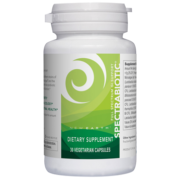 New Earth’s Spectrabiotic brings together twelve different premium probiotic strains, each selected for its unique contribution to our internal ecology, together with a blend of organic Wild Microalgae that provides ideal nourishment for the live probiotic cells and promotes their healthy growth. Vibrant health from the inside out. • Enhanced Digestion • Improved Use of Nutrients from Food • Improved Mood and Outlook via Gut/Brain Axis • Enhances absorption of nutrients Dietary ConsiderationsDairy/ Milk Free Gluten Free Vegetarian Soy Free Vegan Non-GMO Halal Tree Nut Free Peanut Free Serving Size: 1 Capsule Servings Per Container: 30 Amount Per ServingCarbohydrate, less than 1 g Proprietary Blend 300 mg[Inulin, Organic Microalgae (Aph. flos-aquae) Probiotic Blend: Lactobacillus Acidophilus 1.95 Bil CFU, Lactobacillus plantarum 1.80 Bil CFU, Lactobacillus rhamnosus 1.75 Bil CFU, Lactobacillus salivarius 1.65 Bil CFU, Bifidobacterium lactis 1.00 Bil CFU, Lactobacillus paracasei 0.50 Bil CFU, Bifidobacterium breve 0.40 Bil CFU, Lactobacillus casei 0.35 Bil CFU, Streptococcus thermophilus 0.25 Bil CFU, Bifidobacterium longum 0.15 Bil CFU, Bifidobacterium bifidum 0.15 Bil CFU, Latobacillus bulgaricus 0.10 Bil CFU Other Ingredients: Cellulose, plant fiber, fructooligosaccharide (FOS) Take 1 capsule each day. You may wish to adjust this amount based on your individual needs. If pregnant, nursing, or taking prescription drugs, consult your healthcare professional prior to use. Keep in sealed in a cool, dry place.