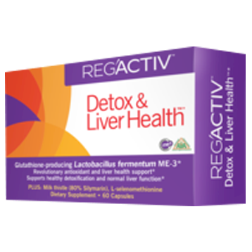 A Probiotic that supports healthy liver function.* Paradigm-changing probiotic produces primary liver health antioxidant.* Reg´Activ Detox & Liver Health* contains the revolutionary probiotic strain Lactobacillus fermentum ME-3. Studied for over 20 years, ME-3 has been found to support healthy glutathione levelsâ€â€a key to healthy liver function.* Glutathione is the body’s “Master Antioxidant.†It is used by every cell in the human body, and it’s absolutely vital for hepatic function. Compared to all other organs, glutathione is found at its highest concentrations in the liver. That’s because liver cells rely on antioxidant glutathione during normal detoxification activities.* Reg´Activ Detox & Liver Health* pairs this powerhouse probiotic strain with additional, more familiar liver health nutrients. Many herbal and nutritive approaches to supporting liver health work well on the glutathione system. Consequently, they all complement ME-3’s activities: • L-selenothionine (easy-to-digest selenium) – Promotes healthy levels of the enzyme glutathione peroxidase, which supports liver tissue health* • L-methionine & N-Acetyl-cysteine – Act as glutathione precursors* • Milk thistle extract (Silymarin) – Supports production of super antioxidant enzymes in the liver*  Dietary Considerations Wheat Free Dairy/ Milk Free Gluten Free Soy Free Egg Free Shellfish Free  Serving Size:2 Capsule  Servings Per Container:30  Amount Per Serving Selenium (as selenomethionine)100 mcg Lactobacillus fermentum ME-3 (equivalent 6 billion** lactic acid bacteria)60 mg Milk thistle fruit extract (80% Silymarin)250 mg N-Acetyl-cysteine200 mg L-Methionine50 mg  Other Ingredients: Rice flour, hypermellose, vegetable magnesium stearate  Directions: Take 2 capsules daily or as directed by a healthcare professional. May be taken with meals or an on empty stomach. For optimal effects, maintain a balanced diet and healthy lifestyle. Product does not contain milk, egg, fish, crustacean, shellfish, tree nuts, wheat (gluten), peanuts or soybeans. Consult your primary health care provider before using this product. Keep out of the reach of children. Store in a dry place at 59-86 degrees