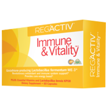 A probiotic that supports immune health.* Paradigm-changing probiotic produces a key immune system antioxidant.* Reg´Activ Immune & Vitality* contains the revolutionary probiotic strain Lactobacillus fermentum ME-3. Studied for over 20 years, ME-3 helps produce glutathioneâ€â€well known for its antioxidant, detoxification, and immune system-supporting activities.* Glutathione is the body’s “Master Antioxidant.†It is used by every cell in the human body and is absolutely vital for immune health. Even in day-to-day life, immune system cells constantly interact with normal oxidative processes. These cells are big spenders when it comes to using the Master Antioxidant. They constantly rely on healthy glutathione levels for basic cellular upkeep.* The Immune & Vitality* blend pairs ME-3 with Lactobacillus brevis KP08. That’s a novel Japanese probiotic strain, which supports normal IFN-? production. Together, ME-3 and KP08 provide highly synergistic immune system effects - supporting both the health of immune system cells and their balanced activity.* Reg´Activ Immune & Vitality* pairs these specialized probiotics with additional more familiar immune system nutrients: • L-Carnitine tartrate – Supports healthy energy levels* • Essential B vitamins - Additional support for healthy energy and metabolism* • Vitamin C - Well-known support for a healthy immune system*  Dietary Considerations Wheat Free Dairy/ Milk Free Gluten Free Soy Free Egg Free Shellfish Free  Serving Size:2 Capsule  Servings Per Container:30 Amount Per Serving Vitamin C (as ascorbic acid)40 mg Thiamin (as thiamin HCl)2 mg Riboflavin2 mg Niacin (as niacinamide)24 mg Vitamin B6 (as pyridoxine HCl)2 mg Lactobacillus fermentum ME-3 (equivalent 4 billion** lactic acid bacteria)40 mg Lactobacillus brevis KP08 (equivalent 1 billion** lactic acid bacteria)100 mg L-Carnitine tartrate200 mg  Other Ingredients: Rice flour, hypermellose, vegetable magnesium stearate  Directions: Take 2 capsules daily or as directed by a healthcare professional. May be taken with meals or an on empty stomach. For optimal effects, maintain a balanced diet and healthy lifestyle. Product does not contain milk, egg, fish, crustacean, shellfish, tree nuts, wheat (gluten), peanuts or soybeans. Consult your primary health care provider before using this product. Keep out of the reach of children. Store in a dry place at 59-86 degrees