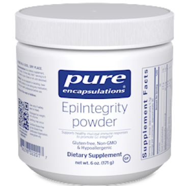 EpiIntegrity powder is designed to promote healthy modulation of mucosal immune response to support gastrointestinal (G.I.) integrity and function. Th2 modulation may be indicated when addressing immune balance in the G.I. tract. L-glutamine is an essential fuel for enterocytes (the cells that line the small intestine and colon), supporting cellular renewal, glutathione production and healthy, everyday tissue repair, while promoting healthy villous function. Arabinogalactan is a prebiotic fiber found in high concentrations in North American larch trees. It has been shown to increase the concentration of beneficial bacteria, such as Bacteroidetes and Faecalibacterium prausnitzii.Beneficial microflora are crucial for proper gut associated lymphoid tissue (GALT) function and development. Research suggests higher levels of F. prausnitzii are associated with healthy cytokine balance and G.I. function. In clinical trials, arabinogalactan has been shown to promote immune cell function. In a randomized three-week trial involving healthy adults, arabinogalactan potentiated the innate immune system, supporting key first-line defense. Perilla supports cytokine homeostasis of the G.I. mucosal tissue. In a randomized, controlled trial involving 50 individuals, 150 mg of Benegut Perilla frutescens extract twice daily offered statistically significant support for G.I. comfort.Research suggests that perilla also helps maintain cytokine balance and stabilize mast cells. Astragalus promotes cytokine balance and supports macrophage, natural killer (NK) cell and T-cell activity. Adaptogens like astragalus support physiological and cellular homeostasis and have positive effects on immune function and antioxidant defenses. Deglycyrrhizinated licorice (DGL) maintains intestinal comfort by supporting the protective mucosal lining.• Offers a unique broad-spectrum combination to promote healthy modulation of mucosal immune response to support G.I. integrity and function • Provides 2.4 g L-glutamine and 2.4 g arabinogalactan per serving • Great-tasting natural strawberry-lemonade flavored powder • Made with hypoallergenic, vegan ingredients Dietary Considerations Gluten FreeNon-GMO Serving Size: 1 Scoop Servings Per Container: 30 Amount Per Serving % Daily Value Calories 15Total Carbohydrate 2.5 g 1%Sodium (naturally occurring) 25 mg 1%Arabinogalactan 2.4 gL-Glutamine (free form) 2.4 gBenegut Perilla (Perilla frutescens) extract (leaf) 150 mgAstragalus (Astragalus membranaceus) extract (root) 200 mgDeglycyrrhizinated licorice (Glycyrrhiza glabra) extract (root) 50 mg Other Ingredients citric acid, natural strawberry and lemonade flavors, malic acid, purified stevia leaf extract Suggested Use As a dietary supplement, take 1 scoop, 1-2 times daily. Add 1 serving to 8 oz. of water or juice. Shake or stir until dissolved. Warning Not to be taken by pregnant or lactating women. If you have any health condition or are taking any medication, consult your health professional before use. Keep out of the reach of children.Use only if safety seal is intact. Packaged by weight, not volume. Settling may occur.