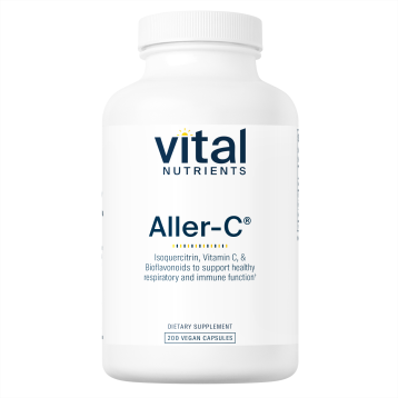 • Features Isoquercitrin, offering the benefits of quercetin with superior absorption and bioavailability• Helps maintain normal respiratory and sinus function during seasonal challenges• Promotes healthy inflammatory balance Best-selling supplement ALLER-C is a potent and effective combination formula designed to help maintain normal respiratory and sinus function. Aller-C features Isoquercitrin, a clinically studied nutraceutical offering the benefits of quercetin with superior absorption and bioavailability, to help promote cellular antioxidant defenses. Aller-C’s combination formula also includes Vitamin C for immune support, Citrus Bioflavonoids to help maintain capillary stability, and Bromelain to promote heatlhy inflammatory balance. This supplement can be used for maintaining and supporting the proper levels of enzymes and physiological factors necessary for normal respiratory and sinus function during seasonal challenges.  Dietary Considerations Wheat Free Dairy/ Milk Free Gluten Free Soy Free Sugar Free Egg Free Casein Free  Suggested Use 2 capsules 2-4 times daily, or as directed by your healthcare professional.  Serving Size: 2 Vegetable Capsule  Servings Per Container: 100  Amount Per Serving % Daily Value Vitamin C (ascorbic acid) 900 mg 1000% Proprietary Blend: 380 mg Citrus Bioflavonoids 92% EMIQ (Enzymatically Modified Isoquercitrin) Bromelain (high potency)  Other Ingredients Vegetable Cellulose Capsule, Cellulose, Leucine  Warnings Store sealed in a cool dry place. Keep out of reach of children. Use only if safety seal is intact.Excludes: Coatings, binders, gluten (wheat, rye, barley), milk/dairy (casein, whey), soy protein, egg protein, sugar.