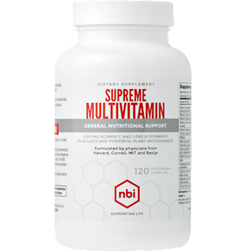 Supreme Multivitamin was created by Dr. Neustadt for his patients when he couldn't find a formula that met his high standards. Supreme Multivitamin delivers: • amino acid chelated minerals, which are the most absorbable form of minerals.* • high doses of B-complex vitamins.* • additional antioxidant protection with CoQ10, grape seed extract, Turmeric root extract standardized to 95% curcuminoids, and citrus bioflavonoids.* • active B12 (as methylcobalamin) and folic acid (as methylfolate) for maximum benefit.*  Serving Size:4 Vegetable Capsule  Servings Per Container:30 Amount Per Serving% Daily Value Vitamin A (as Mixed Carotenoids) (as Betatene)3000 mcg333% Vitamin C (ascorbic acid)1000 mg1111% Vitamin D (as cholecalciferol) (1000 IU)25 mcg125% Vitamin E (as d-apha tocopheryl succinate)134 mg893% Vitamin K (as phylloquinone)100 mcg83% Thiamin (as thiamin mononitrate)50 mg4167% Riboflavin50 mg3846% Niacin (as niacinamide)50 mg313% Vitamin B6 (as pyridoxine HCI)50 mg2941% Folate (as (6s)-5-Methyltetrahydrofolic acid, Glucosamine Salt) (as Quatrefolic) DFE400 mcg100% Vitamin B12 (as methylcobalamin)400 mcg16667% Biotin200 mcg667% Pantothenic acid (as calcium d-pantothenate)75 mg1500% Calcium (as calcium citrate)150 mg12% Iodine (from kelp)25 mcg17% Magnesium (as magnesium amino acid chelate)150 mg36% Zinc (as zinc amino acid chelate)10 mg91% Selenium (as L-selenomethionine)75 mcg136% Copper (as copper amino acid chelate)1 mg111% Manganese (as manganese amino acid chelate)2 mg87% Chromium (as chromium picolinate)200 mcg571% Molybdenum (as molybdenum amino acid chelate)25 mcg56% Potassium (as potassium citrate)80 mg2% Citrus Bioflavonoid Peel Powder Complex75 mg Turmeric Root Extract40 mg Coenzyme Q1010 mg Grape Seed Extract10 mg Boron (as boron citrate)1 mg Vanadium (as vanadyl sulfate)100 mcg Alpha Carotene (as Betatene Mixed carotenoids)190 mcg Cryptoxanthin (as Betatene Mixed carotenoids)45 mcg Zeaxanthin (as Betatene Mixed carotenoids)38 mcg  Other Ingredients: hypromellose (capsule), rice flour, L-leucine As a dietary supplement, adults take 2-4 capsules daily, preferably with food, or as directed by a healthcare provider.  Contains: Soy.  Caution: If you have a medical condition, check with your healthcare provider before taking this product.  Storage: Keep tightly closed in a dry place; do not expose to excessive heat. Keep out of reach of children.