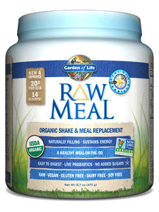 Organic Shake & Meal ReplacementA delicious, organic Meal-On-The-Go packed with incredible nutrition to help you satisfy hunger, manage weight and feel great!- Naturally filling, sustains energy - Easy to digest, live probiotics, no added sugars - Raw, vegan, gluten free, dairy free, soy free - Loaded with 45 Superfoods Serving Size:1 Scoop Servings Per Container:14 Amount per serving: Calories 120 Total Fat 1 g Saturated Fat 0 g Polyunsaturated Fat .5 g Monounsaturated Fat 0 g Trans Fat 0 g Cholesterol 0 mg Sodium 5 mg Potassium 110 mg Total Carbohydrate 7 g Dietary Fiber 5 g Soluble Fiber 1 g Insoluble Fiber 4 g Sugars 1 g Protein 20 g INGREDIENTS: Organic RAW Sprouted Protein Blend Organic Sprouted Brown Rice Protein, Organic Moringa (leaf), Organic Amaranth (sprout), Organic Buckwheat (sprout), Organic Millet (pearl & sprout), Organic Quinoa (sprout), Organic Chia Seed (sprout), Organic Adzuki Bean (sprout), Organic Flax Seed (sprout), Organic Garbanzo Bean (sprout), Organic Lentil (sprout), Organic Pumpkin Seed (sprout), Organic Sesame Seed (sprout), Organic Sunflower Seed (sprout) Organic RAW Fiber Blend Organic Flax Meal, Organic Chia Seed Organic RAW Fruit & Vegetable Blend Organic Spinach (leaf), Organic Baobab (fruit), Organic Apple (fruit), Organic Beet (root), Organic Broccoli (stalk & flower), Organic Carrot (root), Organic Tomato (fruit), Organic Strawberry (fruit), Organic Tart Cherry (fruit), Organic Blackberry (fruit), Organic Green Bell Pepper (fruit), Organic Brussels Sprout (leaf), Organic Blueberry (fruit), Organic Ginger (root), Organic Garlic (bulb), Organic Green Onion (bulb), Organic Raspberry (fruit), Organic Parsley (leaf), Organic Cauliflower (flower & stem), Organic Red Cabbage (leaf), Organic Kale (leaf), Organic Cucumber (gourd), Organic Celery (stalk), Organic Asparagus (flower & stem) Organic Flavor Blend Organic Vanilla Flavor, Organic Stevia Extract (leaf) Organic RAW Greens Blend Organic Spirulina, Organic Alfalfa Grass Juice, Organic Barley Grass Juice, Organic Oat Grass Juice, Organic Wheat Grass Juice RAW Probiotic & Enzyme Blend Lipase, Protease, Aspergillopepsin, beta-Glucanase, Cellulase, Bromelain, Phytase, Lactase, Papain, Peptidase, Pectinase, Xylanase, Hemicellulase, [Lactobacillus plantarum, Lactobacillus bulgaricus] (1.5 Billion/3 Billion CFU) Directions: Mix 1 level scoop (scoop included) with 8 ounces of water for a shake. Mix 2 level scoops with 16 ounces of water for a meal. Delicious with unsweetened almond or rice milk.Contains No soy, dairy, tree nuts, added sugars, filler ingredients, artificial colors, flavors, sweeteners or preservatives.Store in a cool, dry place. Do not use if safety seal is broken or missing. Keep out of reach of children. Packaged by weight, not volume. Settling may occur.ÂÂÂÂ