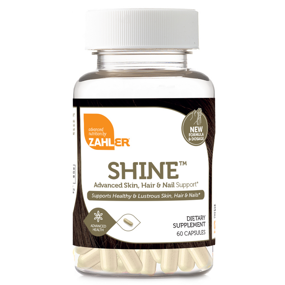 Zahler SHINE is an advanced comprehensive formula including Biotin, Silica, Keratin and more. The potent ingredients in this formula are designed to support healthy and lustrous skin, hair and nails. Additionally, SHINE includes a host of vitamins and minerals and supports both internal and external health. • Advanced Skin, Hair and Nail support • Contains bioactive ingredients for enhanced absorption • Contains Keratin, Lycopene, L-Tyrosine and more Suggested Use Take 4 capsules daily, preferably 2 capsules twice a day with food or as directed by a healthcare practitioner. Serving Size: 2 Capsules Servings per container: 30 Amount Per Serving Vitamin C … 90mg (Ascorbic Acid) Folate … 400 mcg DFE (as L-5-Methyltetrahydrofolate Calcium) Biotin … 300 mcg Iodine … 150 mcg (as Potassium Iodide) Zinc … 5.5mg (as Zinc Bisglycinate Chelate) Selenium … 55 mcg (as Selenium Yeast) Chromium … 70 mcg (as Chromium Picolinate) Hydrolyzed Keratin … 500mg Hyaluronic Acid … 90mg (as Sodium Hyaluronate) Lutein … 3mg (from Lutemax 2020 Aztec Marigold Flower Extract) Zeaxanthin … 0.6 mg (from Lutemax 2020 Aztec Marigold Flower Extract) Other Ingredients Hypromellose (capsule), Dicalcium, phosphate, organic rice hull concentrate, modified corn starch. Warnings Keep out of reach of children. Do not use if safety seal is damaged or missing. If pregnant, nursing or on medication, consult with your healthcare practitioner. Â