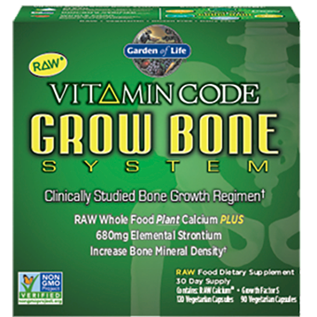 If you are one of the millions of women and men looking to slow normal bone loss that comes with aging, Garden of Life has great news for you. Get ready to experience the Grow Bone System with RAW Calcium and Growth Factor S. The Grow Bone System is intended to stimulate bone growth, increase bone strength and bone mineral density, and has been clinically demonstrated to do so.* Backed by human clinical studies, Garden of Life is confident that the Grow Bone System will help support stronger, healthier bones.* Vitamin Code Grow Bone System includes 756mg of raw whole food plant calcium plus 680mg elemental strontium to increase bone mineral density.* It contains Vitamin Code RAW Calcium, the first RAW whole food plant calcium formula with 1,600IU vitamin D3, RAW MK-7, magnesium and boron that is free from crushed rock, limestone, chalk or animal bones. It also contains Vitamin Code Growth Factor S—680mg of elemental strontium, a critical bone-building trace mineral.* Vitamin Code Grow Bone System is a two-part clinically studied system. In a six-month randomized, open label human clinical study, 176 healthy men and women aged 18 to 85 consumed the ingredients in the Vitamin Code Grow Bone System, along with a healthy eating plan and walking program, and experienced a significant increase in bone mineral density as evidenced by comparing their before and after DEXA scans.* The Grow Bone System is based upon the formula that was used in this clinical study. It is made up of two comprehensive, bone-building formulas, Vitamin Code RAW Calcium and Growth Factor S. The Grow Bone System starts with Vitamin Code RAW Calcium formulated with AlgaeCal RAW Clinical Strength. This patented ingredient is an ocean-derived raw, whole food, plant-form of calcium, naturally rich in 73 bone-building minerals and trace elements. In order to maximize the benefits of Vitamin Code RAW Calcium, Garden of Life has added powerful minerals such as raw magnesium and boron.* Finally, live probiotics and enzymes are added to the product as well as raw fruits and vegetables, for what could be the most complete whole-food calcium supplement available today. • Free from crushed rock, limestone, chalk and animal bones • 1,600 IU Vitamin D3 to help your body absorb calcium efficiently* • 100 mcg Vitamin K2 as MK-7 and Magnesium to support proper utilization of calcium in the bone, where you want it most* • Live probiotics and enzymes support healthy digestion*  Serving Size:3 Capsule  Servings Per Container:30 Vitamin Code RAW Calcium  Amount per serving: Vitamin C* 50 mg Vitamin D* (as D3) 1,600 IU Vitamin K* (as K2 MK-7) 100 mcg Calcium (naturally occurring from Algae) 756 mg Magnesium** 386 mg Strontium (naturally occurring from Algae) 3.8 mg Boron* 3 mg Silica (naturally occurring from Algae) 2.2 mg Vanadium (naturally occurring from Algae) 68 mcg RAW Organic Fruit & Vegetable Blend 360 mg Organic Apple (fruit), Organic Strawberry (fruit), Organic Cherry (fruit), Organic Beet (root), Organic Broccoli (stalk & flower), Organic Carrot (root), Organic Spinach (leaf), Organic Tomato (fruit), Organic Blackberry (fruit), Organic Blueberry (fruit), Organic Raspberry (fruit), Organic Green Bell Pepper (fruit), Organic Brussels Sprout (leaf), Organic Ginger (root), Organic Garlic (bulb), Organic Green Onion (bulb), Organic Parsley (leaf), Organic Cauliflower (flower & stem), Organic Red Cabbage (leaf), Organic Kale (leaf), Organic Cucumber (gourd), Organic Celery (stalk), Organic Asparagus (flower & stem) RAW Probiotic & Enzyme Blend 64 mg Lipase, Protease, Aspergillopepsin, beta-Glucanase, Cellulase, Bromelain, Phytase, Lactase, Papain, Peptidase, Pectinase, Xylanase, Hemicellulase, [Lactobacillus bulgaricus, Lactobacillus plantarum] (500 Million CFU)  Other ingredients: Vegetable cellulose (capsule), organic rice (hull). Vitamin Code Growth Factor S  Amount per serving: Growth Factor S Blend 2 g Strontium Citrate, Strontium* (680 mg of Elemental Strontium) RAW Organic Fruit & Vegetable Blend 75 mg Growth Factor S Probiotic & Enzyme Blend 12 mg Organic Apple (fruit), Organic Beet (root), Organic Broccoli (stalk & flower), Organic Carrot (root), Organic Spinach (leaf), Organic Strawberry (fruit), Organic Tart Cherry (fruit), Organic Tomato (fruit), Organic Blackberry (fruit), Organic Green Bell Pepper (fruit), Organic Blueberry (fruit), Organic Raspberry (fruit), Organic Brussels Sprout (leaf), Organic Ginger (root), Organic Garlic (bulb), Organic Green Onion (bulb), Organic Parsley (leaf), Organic Cauliflower (flower & stem), Organic Red Cabbage (leaf), Organic Kale (leaf), Organic Cucumber (gourd), Organic Celery (stalk), Organic Asparagus (flower & stem) Lipase, Protease, Aspergillopepsin, beta-Glucanase, Cellulase, Bromelain, Phytase, Lactase, Papain, Peptidase, Pectinase, Xylanase, Hemicellulase, [Lactobacillus bulgaricus, Lactobacillus plantarum] (500 Million CFU)  Other ingredients: Vegetable cellulose (capsule), organic rice (hull). Contains no filler ingredients, artificial colors, or preservatives.  Directions: Grow Bone System Suggested Use: Adults take 4 capsules of RAW Calcium daily. For best results take 2 capsules with breakfast and 2 capsules with lunch. Take 3 capsules of Growth Factor S in the evening on an empty stomach. These two products are not meant to be taken at the same time of day. Capsules may be opened and contents added to water or juice.  CAUTION: As with any dietary supplement, consult your healthcare practitioner before using this product, especially if you are under the age of 50 and/or desire to use this product for longer than 6 months, if you know or suspect you may have osteopenia, osteoporosis or other medical conditions. Do not use if you have, or are at high risk for blood clots, heart disease and/or circulatory problems. Do not use if you have kidney disease. Discontinue use and consult a healthcare practitioner in case of rash or hypersensitivity reaction, as this 