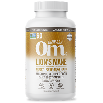 Description The smart mushroom. Lion’s Mane can help spark cognition, focus and clarity*. Om Lion’s Mane capsules are a smart way to help fuel your brain. Om Lion's Mane provides Organic Whole-Food Support: Promotes mental clarity Supports focus & alertness 30 day support  Dietary Considerations Gluten Free Kosher Sugar Free Free of Artificial Colors/Flavors Paleo Friendly  Suggested Use Take three (3) capsules per day with a glass of water.  Serving Size: 3 Vegetable Capsule  Servings Per Container: 30  Amount Per Serving Certified Organic Mushroom Powder Blend:2 g Organic Lion’s Mane (Hericium erinaceus) mycelial biomass & fruit body  Other Ingredients: Vegetable Cellulose (capsule), Organic Myceliated Oats  Warnings Take as directed. If you have a medical condition, are on medication or are pregnant or nursing please seek the direction of a qualified health care professional before using. KEEP OUT OF THE REACH OF CHILDREN. Store in a cool, dry place.