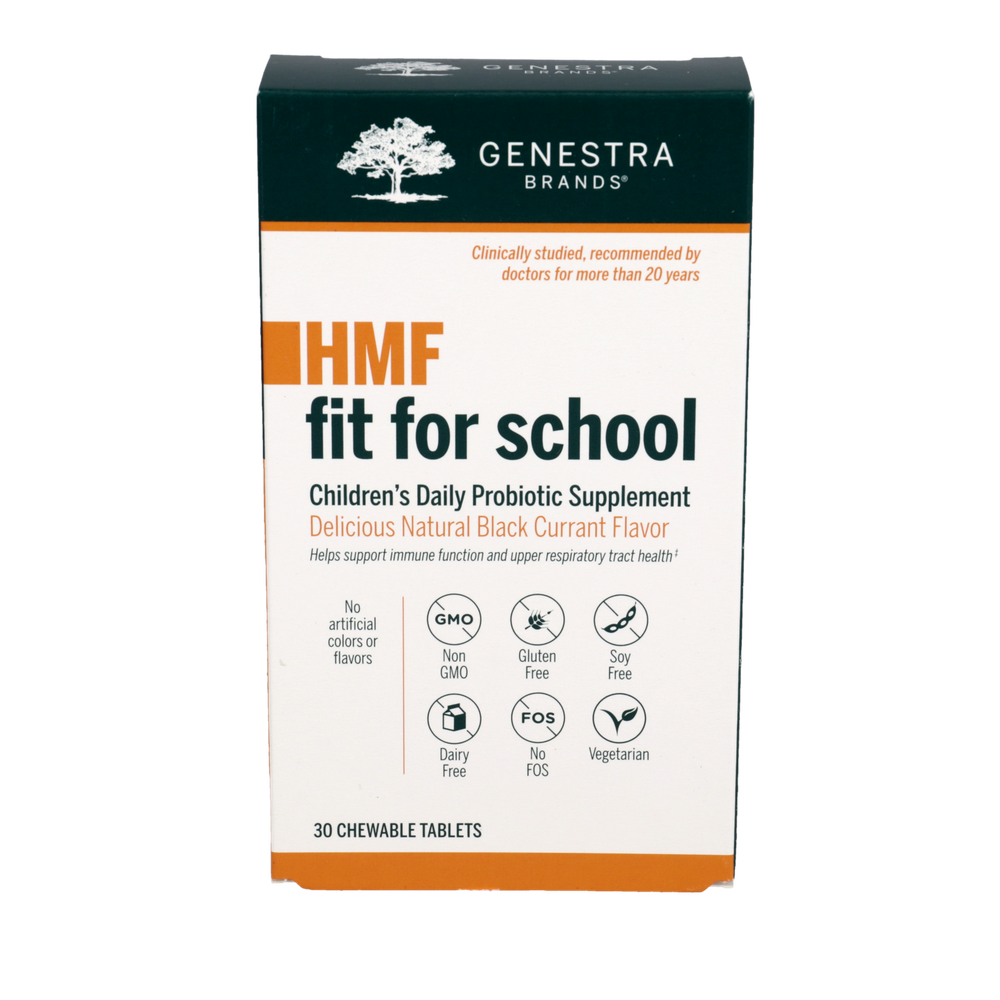 Children’s immune support formula• Helps support immune function and upper respiratory tract health• Provides 12.5 billion CFU of live microorganisms that temporarily modify gut flora• Includes 50 mg of vitamin C and 1000 IU of vitamin D per serving• Chewable tablets with a delicious natural blackcurrant flavorHMF Fit For School includes a combination of research-driven probiotic strains and vitamin C that supports children’s upper respiratory tract health and immune function. In a recent clinical trial, 57 schoolchildren were randomized to receive either a placebo tablet or HMF Fit For School’s probiotic formula plus 50 mg of vitamin C daily for 6 months. Children in the probiotic plus vitamin C group had significant improvement in upper respiratory tract health. HMF Fit For School also includes 25 mcg (1000 IU) of vitamin D per tablet to provide additional immune support.  Dietary considerations Gluten free Dairy free Soy free Milk free Artificial preservative free Wheat free Artificial Color / Colour Free Artificial Flavor / Flavour Free  Suggested use Adolescents and Children (4 years and older): Chew one tablet daily or as recommended by your healthcare practitioner. Serving Size: 1 Tablet  Servings per container: 30  Amount Per Serving Vitamin C ... 50mg(ascorbic acid) Vitamin D3 ... 1000IU(cholecalciferol) Probiotic Consortium ... 12.5 billion CFU Lactobacillus acidophilus (CUL-21) Lactobacillus acidophilus (CUL-60) Bifidobacterium animalis subsp. lactis (CUL-34) Bifidobacterium bifidum (CUL-20)  Other Ingredients Xylitol, blackcurrant fruit extract, sorbitol, natural blackcurrant flavor, silica, magnesium stearate Guaranteed to contain no added wheat, gluten, soy, artificial coloring or flavoring, antimicrobial preservatives or dairy products. Ideal for vegetarians.  Warnings Guaranteed to contain no added wheat, gluten, soy, artificial coloring or flavoring, antimicrobial preservatives or dairy products. Ideal for vegetarians. Quality Assurance: Safety-sealed for your protection and for product freshness. Do not use if the blister pack has been tampered with. Store under refrigeration (below 46 °F). Keep out of reach of children.Risk Information: If you have an immune-compromised condition, do not use. If you are experiencing nausea, fever, vomiting, bloody diarrhea or severe abdominal pain, consult your healthcare practitioner prior to use. If symptoms of digestive upset occur, discontinue use and consult your healthcare practitioner.