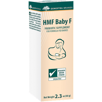 Probiotic for infants• Helps promote healthy immune function and skin health• Helps to reduce incidence of skin sensitivityHMF Baby F probiotic formula for formula-fed babies provides Lactobacillus salivarius, Lactobacillus paracasei, Bifidobacterium bifidum and Bifidobacterium animalis subsp. lactis, which help to promote immune function and skin health in children. HMF Baby F contains galactooligosaccharides (GOS), a type of prebiotic fiber found naturally with breast milk that may help to support a healthy gastrointestinal microflora in infants. Fructooligosaccharides (FOS) are also included for additional prebiotic fiber content. HMF Baby F powder dissolves easily into milk or water, and is free of gluten and soy. Ideal for vegetarian children.  Dietary considerations Gluten free Soy free Artificial preservative free Wheat free Artificial Color / Colour Free Artificial Flavor / Flavour Free  Suggested use Children (1-4 years): In a glass, add water or milk to one scoop of HMF Baby F and mix. Take once daily with a meal, at least two to three hours before or after taking antibiotics, or as recommended by your healthcare practitioner.  Serving Size: One Scoop  Servings per container: 60  Amount Per Serving Probiotic Consortium 10 billion.CFU Bifidobacterium bifidum (CUL-20) Bifidobacterium animalis subsp. lactis (CUL-34) Lactobacillus salivarius (CUL-61) Lactobacillus paracasei (CUL-08)  Other Ingredients Transgalactooligosaccharides (GOS) (from milk), fructooligosaccharides (FOS) Contains: Milk Guaranteed to contain no added wheat, starch, gluten, soy, artificial colouring or flavouring or antimicrobial preservatives. Ideal for vegetarians.  Warnings Daily Value not established Contains: Milk Information: If you have an immune compromised condition, do not use. If you are experiencing fever, vomiting, bloody diarrhea or severe abdominal pain, consult your healthcare practitioner prior to use. If symptoms of digestive upset occur, worsen or persist beyond three days, discontinue use and consult your healthcare practitioner.Guaranteed to contain no added wheat, starch, gluten, soy, artificial coloring or flavoring or antimicrobial preservatives. Ideal for vegetarians. Gluten Free.Quality Assurance: Safety-sealed for your protection and for product freshness. Store under refrigeration(below 46 °F).