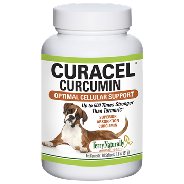 Description Your dog is thinking about his next treat or game of fetch, not his health. Pets rely on you to be thinking about antioxidants that help remove damaging free radicals. You have the answer—Curacel Curcumin from Terry Naturally Animal Health offers optimal cellular support for dogs. You can help maintain the health of your dog with the best curcumin available—the only bioavailable curcumin from turmeric with turmeric essential oil and ar-turmerone.  Suggested Use Up to 75 lbs: 1 softgel daily. Over 75 lbs: 1-2 softgels daily.  Product Facts Active Ingredients per 1 Softgel (873 mg) Proprietary Blend 375 mg Curcumin (Curcuma longa) Rhizome Extract (BCM-95/ Curcugreen) enhanced with turmeric essential oil and standardized for curcuminoid complex (curcumin, demethoxycurcumin and bisdemethoxycurcumin), phospholipids (sunflower lecithin), supplying 250 mg of pure curcuminoids  Inactive Ingredients: beeswax, gelatin, glycerin, medium chain triglycerides, purified water, silica, and turmeric in sunflower oil (softgel color).  Warnings Safe use in pregnant animals or animals intended for breeding has not been proven. If animal’s condition worsens or does not improve, stop product administration and consult your veterinarian. Federal law prohibits the off-label use of this product in ruminants.