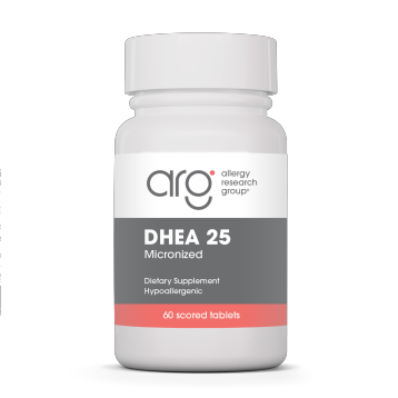 Micronized, plant-sourced DHEA formulated in a lipid matrix to bypass the liver, with a particle size of less than 50 microns. Soy free – the source material (wild yam) is non-irradiated and non-ethylene-oxide-treated. Serving Size: 1 Tablet Servings Per Container: 60 Amount Per Serving: Dehydroepiandrosterone 25 mg Other Ingredients: Microcrystalline cellulose, Micosolle, vegetable oil, vegetable wax, Cab-o-sil, magnesium stearate, vitamin E As a dietary supplement, for women ½ to 1 tablet per day; for men 1 tablet one or two times per day; or as directed by a health care professional. Not for use by individuals under the age of 18 years. Do not use if pregnant or nursing. Consult a physician or licensed qualified health care professional before using this product if you have, or have a family history of, prostate cancer, prostate enlargement, heart disease, low good cholesterol (HDL), or if you are using any other dietary supplement, prescription drug, or over-the-counter drug. Do not exceed recommended serving. Exceeding recommended serving may cause serious adverse health effects. Possible side effects include acne, hair loss, hair growth on the face (in women), aggressiveness, irritability, and increased levels of estrogen. Discontinue use and call a physician or licensed qualified health care professional immediately if you experience rapid heartbeat, dizziness, blurred vision, or other similar symptoms. Keep out of reach of children. To report any adverse events call 1-800-332-1088. Keep in a cool, dry place tightly capped. Hypoallergenic