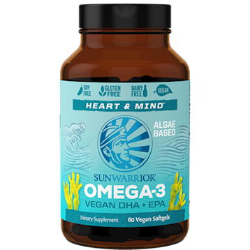 Description Sunwarrior skipped the krill/fish and has gone straight to the source for its plant-based algae Omega-3 DHA + EPA. It is sustainably grown and harvested for bioavailable Omega-3, 6, 7, and 9 fatty acids. It also contains essential polar lipids and chlorophyll. These ingredients support healthy inflammation response and support cardiovascular health.* It promotes healthy vision, joints and brain health*. Marine sources such as fish and krill do not produce the omega-3 fatty acids, but rather accumulate it in their fatty tissue from the algae they consume. Fatty tissue also accumulates industrial and environmental contaminants; thus oils derived from these tissues contain high concentrations of toxins. Since fish are the most economical way to extract essential fatty acids, the demand for fish oil supplements is affecting the world’s fish population. Over 70% of fish species are either fully exploited or depleted. Studies have predicted that if overfishing continues, there will be a complete collapse of the ocean’s ecosystem by 2048.  Dietary Considerations Dairy/ Milk Free Gluten Free Soy Free Vegan  Suggested Use 2 softgels together daily.  Serving Size: 2 SoftGel  Servings Per Container: 30  Amount Per Serving Calories20 Total fat2 g Cholesterol13 mg Algae oil1650 mg Total omega fatty acids693 mg EPA (eicosapentaenoic acid)113 mg DHA (docosahexaenoic acid)500 mg Other omega 3s14 mg Omega 6 fatty acids20 mg Omega 7 fatty acids36 mg Omega 9 fatty acids10 mg Polar lipids60 mg Chlorophyll8 mg  Other Ingredients: Vegan softgel (non-gmo cornstarch, seaweed extract, vegetable based glycerin, sorbitol (from non-gmo corn), purified water, lemon oil  Warnings Soy free. Gluten free. Dairy free. Vegan.