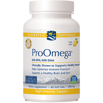 Description Ideal for pesco-vegetarians, ProOmega in fish gelatin soft gels is a double strength EPA+DHA formula for more omega-3 benefits in fewer servings. For high intensity, therapeutic support for both body and mind, ProOmega is an excellent choice, containing 1100 mg EPA+DHA per serving. Supports cardiovascular and circulatory health* Promotes a healthy immune response* Supports a healthy metabolism and blood sugar levels* Supports a positive mood and emotional well-being* Promotes improved joint flexibility and mobility* Fish gelatin soft gels are ideal for pesco-vegetarians Suggested Use: Two soft gels daily, with food, or as directed by your health care professional or pharmacist. For intense support, take two soft gels with food twice daily. Dietary Considerations Dairy/ Milk Free Gluten Free Free of Artificial Colors/Flavors Non-GMO Serving Size: 2 SoftGel Servings Per Container: 30   Amount Per Serving Calories 20  Calories from fat 20  Total Fat 2 g 3% Saturated Fat 0.1 g 1% Trans Fat 0 g  Total Omega-3s 1280 mg  EPA (Eicosapentaenoic Acid) 650 mg  DHA (Docosahexaenoic Acid) 450 mg  Other Omega-3s 180 mg  Other ingredients: purified deep sea fish oil (from anchovies and sardines), soft gel capsule (gelatin,glycerin,water,natural lemon flavor), natural lemon flavor, d-alpha tocopherol, rosemary extract (a natural preservative)    Warnings No gluten, milk derivatives, or artificial colors or flavors. Store in a cool, dry place, away from sunlight Do not take if tamper-evident seal is broken or missing. Keep out of the reach of children Consult with your physician before using this product if you are allergic to iodine, use blood thinners, or anticipate surgery.