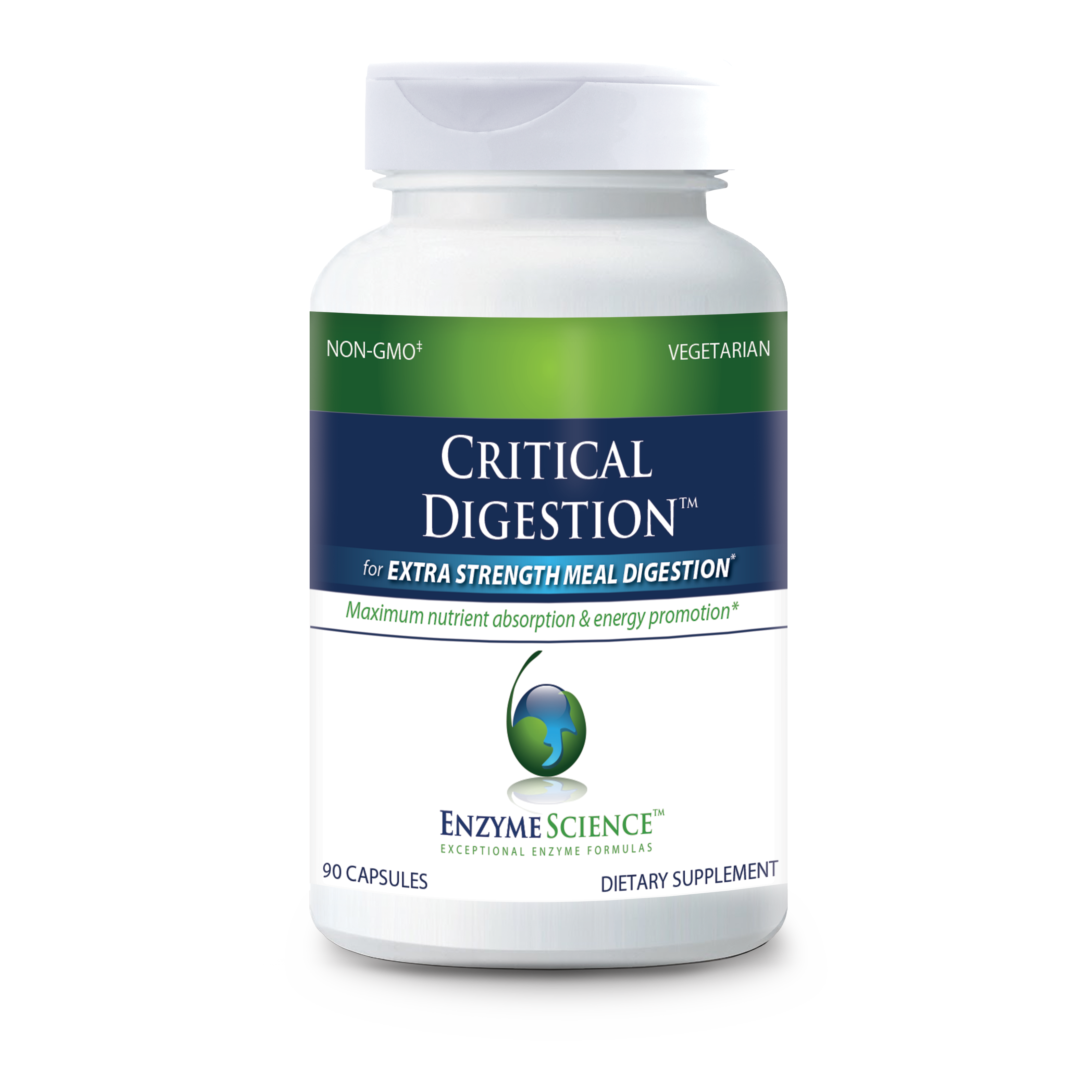 Critical Digestion is an unparalleled formula that supports the entire digestive process.* Powerful enzyme blends cover all of the building blocks of food to support maximum breakdown, nutrient absorption and energy promotion.* Enzyme supplementation allows the body to break down food more efficiently, eliminating occasional discomforts like gas, bloating and indigestion, while also helping to ensure that your body is getting the fuel it needs for you to feel at your best.* In combination with digestive enzymes, Critical Digestion utilizes 1 billion CFU’s of a shelf stable multi-strain blend of Bacillus subtilis and lactic acid bacteria. Probiotics enhance intestinal flora to influence the microbiome and set the stage for optimal health.* The B. subtilis strain DE111 enhances the probiotic blend for supporting not only digestive but also immune health.* Enzyme Science formulates each enzyme focused product with exclusive Thera-blend enzymes. The Thera-blend process is scientifically designed to provide optimal solutions for digestive health and wellness. These unique protease, amylase, cellulase and lipase enzymes are comprised of multiple variants which are blended to work synergistically throughout the broad pH range of the human body.  Highest-potency digestive enzyme blend  Hardy probiotic blend at 1 Billion CFU per capsule in combination with probiotics  For fat, fiber, protein, and carbohydrate digestion*  Dietary Considerations Wheat Free Dairy/ Milk Free Gluten Free Vegetarian Soy Free Yeast Free Preservative Free Salt Free Corn Free Free of Artificial Colors/Flavors Egg Free Non-GMO Tree Nut Free Peanut Free Casein Free  Serving Size:1 Vegetable Capsule  Servings Per Container:30  Amount Per Serving Amylase Thera-blend 23000 DU Protease Thera-blend  HUT75000 ATPro  Blend78 mg Magnesium Citrate CoQ10 Phytase ATP Glucoamylase AGU50 DPP-IV DPPU250 Lipase Thera-blend 4000 USP/FIP Alpha Galactosidase500 GaIU Pectinase Endo-PGU150 Cellulase Thera-blend CU1500 Lactase ALU900 Beta Glucanase BGU25 Xylanase XU1000 Maltase DP200 Probiotic Blend Billion1 CFU DE111 Bacillus subtilis Lactobacillus paracasei plantarum gasseri rhamnosus casei acidophilus DDS-1 bulgaricus Invertase SU535 Hemicellulase HCU50  Other Ingredients: 100% Vegetarian Capsule (Cellulose, water)   Recommended Dose: Take 1 capsule per meal with the first bite of food. More may be taken as recommended by your healthcare practitioner.  Contains No: egg, dairy, preservatives, salt, sucrose, soy, wheat, yeast, nuts, corn, gluten, casein, potato, artificial colors or flavors. Vegetarian. Non-GMO.  Keep closed in dry place; avoid excessive heat.  As with all products, please keep out of reach of children.