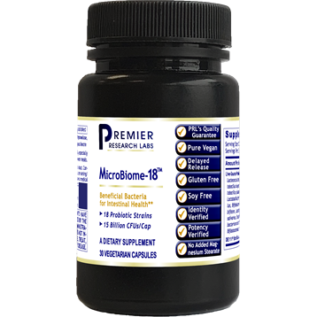 MicroBiome-18, Premier. Beneficial Bacteria for Intestinal Health.Dietary Supplement. 30 Plant-Source Capsules. “PRL’s signature FermExcel-100 line is an industry first!†Full-spectrum probiotic formula containing 18 beneficial strains. Contains 15 billion CFUs per capsule. Features the highly effective patented bacteria, DE111 Bacillus subtilis. Supports favorable intestinal microbial balance and gut health.Dietary ConsiderationsGluten FreeSoy FreeVeganServing Size: 1 Vegetable CapsuleServings Per Container: 30Amount Per ServingLive-Source Probiotic Complex: (10 billion CFU) 200 mgLactococcus lactisLactobacillus rhamnosusLactobacillus bulgaricusLactobacillus caseiLactobacillus plantarumLactobacillus paracaseiLactobacillus fermentumLactobacillus acidophilusBifidobacterium longumBifidobacterium bifidumLactobacillus reuteriLactobacillus salivariusStreptococcus thermophilusBifidobacterium animalis lactisLactobacillus gasseriBifidobacterium breveBifidobacterium lactisDE111 Bacillus subtilis (5 billion CFU) 21 mgOther Ingredients:Rice Hull, Capsule (Hypromellose, Water), Capsule (Gellan Gum), Rice Bran, Tapioca DextrinTake 1 capsule daily, especially effective between meals.Use only if inner seal is intact. Consult your health practitioner if you are pregnant/nursing, taking medications or have a medical condition, before taking this product. Keep out of reach of children.