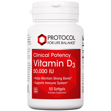 The major biologic function of vitamin D is to maintain healthy blood levels of calcium and phosphorus. Vitamin D supports bone health by promoting calcium absorption and bone mineralization. Vitamin D also plays an important role in immune function and helps to regulate cell growth and differentiation.Dietary ConsiderationsWheat FreeDairy/ Milk FreeGluten FreeSoy FreeYeast FreeCorn FreeEgg FreeShellfish FreeNon-GMOFish FreeServing Size: 1 SoftGelServings Per Container: 50Amount Per Serving % Daily ValueVitamin D3 (as Cholecalciferol) (from Lanolin) (50,000 IU) 1250 mcg 6250%Other Ingredients:Organic Extra Virgin Olive Oil, Softgel Capsule [bovine gelatin (BSE-free)], glycerin, waterTake 1 softgel with a fat-containing meal as directed by your healthcare practitioner (typically once per week). This product is intended to be used under the supervision of a healthcare professional and not for daily use. Vitamin D and calcium levels should be monitored while taking this product. Do not exceed recommended dose.If pregnant or nursing, consult your healthcare practitioner before using this product. Vitamin D should be used cautiously by those taking cardiac glycosides and anyone with hypercalcemia. Vitamin D supplements may interact with atorvastatin and thiazide diuretics. If you are taking any of these prescription medications, consult your healthcare practitioner before using this product. Consult healthcare practitioner in case of recurring GI discomfort, excessive thirst and urination, muscle pain, weakness, or palpitation. Keep out of reach of children.