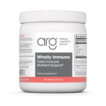 Originally formulated by Dr Friedrich Douwes, MD, founder of the renowned Klinik St. Georg in Bad Aibling, Germany, and Stephen A Levine, PhD, founder of Allergy Research Group, Wholly Immune is a comprehensive blend of nutrients and herbs designed to support general nutrition and immune system function, provide antioxidant support, and support liver detoxification. This reformulated proprietary blend of herbs and nutrients now includes riboflavin-5-phosphate, P5P, 5-MTHF, and methylcobalamin, as well as MaitakeGold 404 mushroom blend, and SelenoExcell selenium complex. Convenient powder form is a fraction of the cost of these nutrients taken separately. MaitakeGold 404 is a trademark of Tradeworks Group, Inc. SelenoExcell is a registered trademark of Cypress Systems Inc. Serving Size: 1 Scoop Servings Per Container: 45 Amount Per Serving % Daily ValueCalories 74 Total Fat 0.7 g 1% Sodium 69 mg 3% Total Carbohydrates 10 g 3% Dietary Fiber 3 g 12% Total Sugars 0.5 g Protein 6.6 g 13% Iron (naturally occurring) 1.3 mg 7% Vitamin A (as 5000 IU of Retinyl Acetate) RAE 1502 µg 167% Vitamin C (as Calcium Ascorbate) 1 g 1111% Vitamin D3 (as 800 IU of Cholecalciferol) 20 µg 100% EVNolMax 15% Powder (non-GMO) containing: 34 mg Vitamin E (as 1.4 IU of d-Alpha Tocopherol) 0.94 mg 6% Natural d-Mixed Tocotrienols: d-Gamma-Tocotrienol, d-Alpha-Tocotrienol, d-Delta-Tocotrienol, d-Beta-Tocotrienol 3.74 mg Thiamine (as Hydrochloride) 10 mg 833% Riboflavin (as Riboflavin-5-phosphate) 10 mg 769% Niacin (as 50% Niacinamide and 50% Nicotinic acid) NE 25 mg 156% Vitamin B6 (Pyrodoxine Hydrochloride) 10 mg 588% Folate (as 100 μg of 5-Methyltetrahydrofolate Biofolate) 167 µg 42% Vitamin B12 (as Cyanocobalamin) 200 µg 8333% Biotin (as d-Biotin) 100 µg 333% Pantothenic Acid (as Calcium Pantothenate) 25 mg 500% Calcium (Ascorbate, Citrate, Gluconate, Pantothenate) 135 mg 10% Iodine (as Potassium Idodide) 50 µg 33% Magnesium ( as Citrate, Bisglycinate) 150 mg 36% Zinc (as Zinc Citrate) 15 mg 136% Selenium (as Sodium Selenite) 100 µg 182% Copper (as Copper Bisglycinate) 1 mg 111% Manganese (as Manganese Citrate) 2 mg 87% Chromium (as Chromium Picolinate) 50 µg 143% Molybdenum (as Sodium Molybdate) 100 µg 222% Potassium (as Potassium Gluconate and Potassium Iodide) 100 mg 2% N-Acetyl Cysteine 250 mg Lycopene 4 mg L-Carnitine 250 mg Taurine 125 mg Trimethylglycine 250 mg Quercetin Dihydrate 250 mg Sulforaphane (Broccoli Extract 20:1) (Brassica oleracea) 100 mg Decaffeinated Green Tea (Leaves) Extract (30% Catechins and 40% Polyphenols) (Camellia sinensis) 200 mg MaitakeGold 404 5% with Multi-Mycelia Blend containing: 150 mg Ganoderma lucidum Pleurotus ostreatus Coriolus vesicolor Schizophyllum commune Hericium erinaceus Lentinula edodes Grifola frondosa Inontus obliquus Poria cocos Agaricus blazei MaitakeGold 404 (Grifola frondosa extract) Bromelain (1200 GDU/g) 200 mg Turmeric (Root) Extract (95% Curcuminoids) 500 mg Asian Panax Ginseng (Root) Extract (12% Ginsenosides) 250 mg Astragalus (Root) Extract (40% Polysaccharide) 250 mg Alpha Lipoic Acid 100 mg  Other Ingredients: Psyllium husks, whey protein concentrate, oat bran, xylitol, rice bran, apple fiber, soy protein concentrate, silicon dioxide As a dietary supplement, 1 level scoop one or two times daily, mixed with desired liquid, or as directed by a healthcare practitioner. Variations in product color may occur. Keep in a cool, dry place, tightly capped. Product is sold by weight, not volume. Some settling may occur. Contains: Soy.