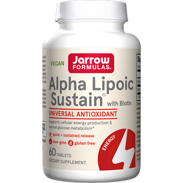 "Alpha Lipoic Acid (ALA) is an antioxidant that supports normal glucose metabolism and cellular energy production. Jarrow Formulas Alpha Lipoic Sustain is formulated with advanced bilayer Sustain tablets that combine 1/3 Quick Release and 2/3 Sustained Release formats to raise and to maintain ALA blood levels over time."  Dietary Considerations Wheat Free Dairy/ Milk Free Gluten Free Vegetarian Soy Free Vegan Egg Free Shellfish Free Fish Free Tree Nut Free Peanut Free  Suggested Use Take 1 tablet 1 or 2 times per day with meals or asdirected by your qualified healthcare professional.  Serving Size: 1 Tablet  Servings Per Container: 60  Amount Per Serving Biotin 330 mcg Alpha Lipoic Acid (thioctic acid) 300 mg  Other Ingredients Calcium phosphate, microcrystalline cellulose, glyceryl behenate, stearic acid (vegetable source), beet root powder (for color), natural flavor, magnesium stearate (vegetable source), silicon dioxide, coating (hydroxypropylmethylcellulose, stearic acid [vegetable source]).  Warnings No wheat, no gluten, no soybeans, no dairy, no egg, no fish/shellfish, no peanuts/tree nuts. Suitable for vegetarians/vegans.If you have a medical condition (especially diabetes or being treated for glucose control), are pregnant, lactating, trying to conceive, under the age of 18, or taking medications (especially for glucose control), consult your healthcare professional before using this product. Keep out of the reach of children.Store in a cool, dry place.NOTE: During use, advise your medical professional that you are taking Biotin before any blood tests. Consult a healthcare professional before using this product if you are trying to conceive, pregnant, or lactating, under the age of 18, or have a medical condition (especially if being treated for glucose control); if adverse reactions occur, discontinue use.