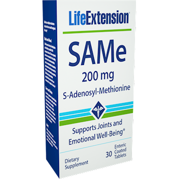 Mood, joint & liver support Life Extension's Best Seller SAMe, or S-Adenosyl-Methionine, benefits many critical metabolic functions in the body. This amazing compound helps maintain a stable mood and supports both joint and liver health. Dietary considerations: Non-GMO Serving size: 1 Tablet Servings per container: 30 Suggested Use: Take one tablet one to three times daily in divided doses, preferably on an empty stomach, or as recommended by a healthcare practitioner. Take with co-factors vitamins B12, B6, and folic acid. Amount Per Serving: S-Adenosyl-Methionine 200mg Other Ingredients: Cellulose, mannitol, methacrylic acid copolymer, citric acid, stearic acid, silica, hypromellose, glyceryl triacetate, sodium starch glycolate, croscarmellose sodium, calcium carbonate, yellow ochre. Warning: When using nutritional supplements, please consult with your physician if you are undergoing treatment for a medical condition or if you are pregnant or lactating. Do not purchase if outer seal is broken or damaged. Keep out of reach of children. Do not exceed recommended dose. SAMe should not be taken by those diagnosed with bipolar disorder.