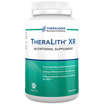 Formulated with an extended-release coating, TheraLith XR is a gentle choice for your digestive system. With vitamin B6, potassium citrate, and magnesium, TheraLith XR is designed to help support healthy urine chemistry. Dietary ConsiderationsGluten Free Vegan Serving Size: 2 Tablet Servings Per Container: 180 Amount Per Serving % Daily ValueVitamin B6 (as pyridoxine hydrochlroide) 7.5 mg 441% Magnesium (as 50% magnesium citrate, 50% magnesium oxide) 180 mg 43% Potassium (as potassium citrate) 99 mg 2% Other Ingredients: Microcrystalline cellulose, vegetable stearic acid, vegetable magnesium stearate, silicon dioxide, white enteric coating (hypromellose), polydextrose, calcium carbonate, medium chain triglycerides, purified water, ethylcellulose, ammonium hydroxide, oleic acid, sodium alginate Take two tablets, twice a day, with meals. For example, take two tablets with breakfast and two tablets with dinner. Do not exceed recommended dosage. Keep out of children's reach. Store away from heat and moisture.