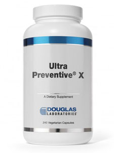 Ultra Preventive X is Douglas Laboratories most comprehensive multivitamin and bioavailable mineral supplement, with an organic fruit, vegetable and phytonutrient blend for optimal health.*Ultra Preventive X, Douglas Laboratories signature formula, has been updated with new and improved ingredients, including vitamin K2 for bone and vascular health, bioflavonoids from quercetin, and alpha lipoic acid for healthy blood sugar metabolism. In addition, Ultra Preventive X now contains an organic phytonutrient blend with polyphenols, increased choline content for methylation and liver support, increased lutein and zeaxanthin for vision health, three types of vitamin B12, and improved mineral forms for bioavailability.*Dietary ConsiderationsGluten FreeNon-GMOServing Size:Â 8 TabletServings Per Container:Â 30Amount Per Serving% Daily Value Vitamin A (as 67% natural beta-carotene and 33% vitamin A palmitate)4500 mcg500% Vitamin C (as ascorbic acid)1000 mg1111% Vitamin D-3 (as cholecalciferol) (1,000 IU)25 mcg125% Vitamin E (as natural d-alpha tocopheryl succinate plus mixed tocopherols)134 mg893% Thiamine (as thiamine HCl)100 mg8333% Riboflavin (as riboflavin/riboflavin-5-phosphate)50 mg3846% Niacin/Niacinamide190 mg1188% Vitamin B-6 (as pyridoxine HCl)100 mg5882% Vitamin B-6 (as pyridoxal-5-phosphate) Folate (as Metafolin, L-5-MTHF) (800 mcg L-5-MTHF) DFE1333 mcg333% Vitamin B-12 (as methylcobalamin adenosylcobalamin/hydroxocobalamin)500 mcg20833% Biotin300 mcg1000% Pantothenic Acid (as d-Calcium Pantothenate)100 mg2000% Choline (from choline bitartrate)275 mg50% Calcium (as calcium citrate/malate/chelate complex)420 mg32% Iodine (from Kelp)200 mcg133% Magnesium (as magnesium citrate/chelate complex)420 mg100% Zinc (as OptiZinc, monomethionine)25 mg227% Selenium (as selenomethionine)200 mcg364% Copper (as copper chelate)2 mg222% Manganese (as manganese sulfate)9 mg391% Chromium (as chromium polynicotinate)200 mcg571% Molybdenum (as Molybdenum Krebs )100 mcg222% Potassium (as potassium chloride)100 mg2% N-Acetyl L-Cysteine150 mg Betaine HCI150 mg Inositol100 mg Quercetin (as dihydrate)100 mg Lemon Bioflavonoids100 mg Papain (from Carica papaya, fruit)100 mg Bromelain (from Anana comosus, pineapple stem)50 mg Grape Seed Extract (standardized to 95% polyphenols)50 mg Alpha Lipoic Acid50 mg Rutin (from Sophora japonica, flower)25 mg Boron (as boron glycinate)3 mg Vanadium (as Vanadium Krebs )50 mcg Vitamin K2 (as menaquinone-7)45 mcg Proprietary Organic Fruit and Vegetable Blend700 mg Organic Beet Powder (root) Organic Carrot Powder (root) Organic Black Currant Powder (fruit) Organic Blueberry Powder (fruit) Organic Broccoli Powder (whole plant) Organic Concord Grape Powder (fruit) Organic Collard Greens Powder (leaf) Organic Pomegranate Powder (fruit) Organic Green Cabbage Powder (whole plant) Organic Cranberry Powder (fruit) Organic Kale Powder (whole plant) Organic Parsley Powder (whole plant) Organic Raspberry Powder (fruit) Organic Spinach Powder (whole plant) Organic Phytonutrient Blend Organic Spirulina (whole plant)100 mg Organic Chlorella (whole plant, broken cell wall)100 mg Organic Green Tea Leaf Extract (standardized to 50% polyphenols, 20% EGCG)50 mg Carotenoids Lutein (from marigold flower Tagetes erecta) extract)10 mg Lycopene (from tomatoes)6 mg Zeaxanthin Isomers (from marigold (Tagetes erecta) flower extract)2 mg Other Ingredients:Microcrystalline cellulose, hydroxypropyl cellulose, croscarmellose sodium, ascorbyl palmitate, silica, coating (purified water, hypromellose), glycerinAs a dietary supplement, adults take 4 tablets twice daily or as directed by your health professional. This product is best taken with meals.Not to be taken by pregnant or lactating women. If you have any health condition or are taking any medication, consult your health professional before use. Discontinue immediately if a burning sensation occurs. Not recommended for people with ulcers. Consult a health professional prior to use if you are taking blood thinners. Take with food. If you have liver problems, consult your health professional before use.Keep out of reach of children. Store in a cool, dry place. Use only if safety seal is intact.