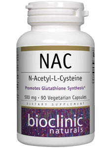 Dietary Supplement- Promotes Glutathione Synthesis*NAC supports the body’s natural detoxification process and the production and utilization of glutathione, an amino acid manufactured in the body that is a powerful antioxidant and free radical scavenger.* NAC also supports immune function in adults over 65, who are suffering from degenerative diseases and helps relieve symptoms of bronchitis.* Contains no artificial preservatives, colors or sweeteners; no corn, dairy, gluten, soy, wheat or yeast. Bioclinic Naturals™ products are guaranteed to meet or exceed Good Manufacturing Practices (GMP) of the Canadian Government and the Therapeutic Goods Administration (TGA) regulations of Australia among the world’s highest standards for natural products.Suggested Usage: 1 capsule per day or as directed by a health care professional.Supplement FactsServing Size 1 CapsuleAmount Per ServingNAC (N-Acetyl-L-Cysteine) (free form) 500 mgOther ingredients: Rice starch, vegetarian capsule (carbohydrate gum [cellulose],purified water), magnesium stearate (vegetable grade).Caution: Consult a health care professional prior to use if you are taking nitroglycerin. Do not use if you have acetylcysteine allergy, or if you are pregnant or breastfeeding. Consult a health care professional prior to use if you are taking antibiotics. Consult a health care professional if you have cystinuria. Keep out of reach of children.* This statement has not been evaluated by the Food and Drug Administration. This product is not intended to diagnose, treat, cure or prevent any disease.