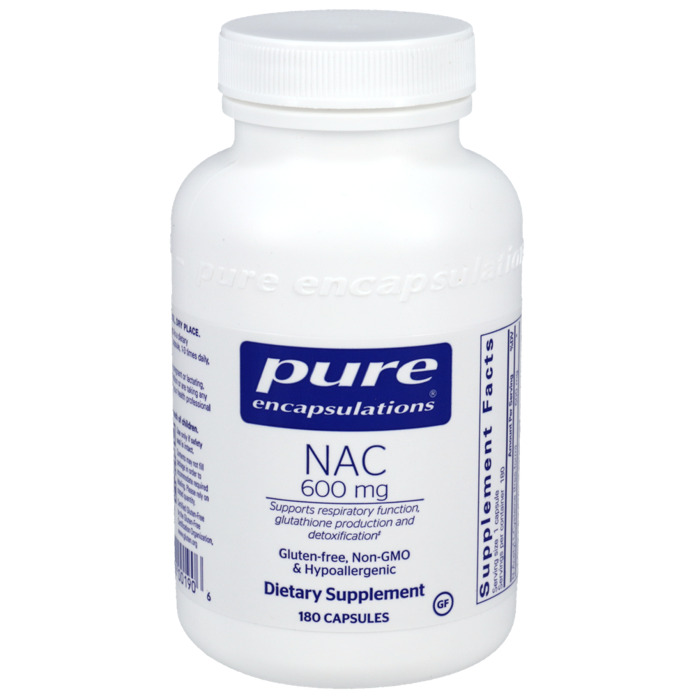 Supports respiratory function, glutathione production and detoxification N-Acetyl-l-Cysteine (NAC) is a derivative of the dietary amino acid l-cysteine. NAC has a high affinity for lung tissue, which it supports through mucolytic and antioxidant action. NAC supports tissue levels of glutathione, a key component of the antioxidant defense system. • Supports cellular antioxidant defense system • Promotes healthy lung tissue • Made with hypoallergenic ingredients  Dietary Considerations Gluten Free Non-GMO  Amount Per Serving N-Acetyl-L-Cysteine (free-form)600 mg  Other Ingredients vegetarian capsule (cellulose, water), ascorbyl palmitate  Suggested Use As a dietary supplement, take 1 capsule, 1-3 times daily, between meals.  Warning If you are pregnant or lactating, have any health condition or are taking any medication, consult your health professional before use. Keep out of the reach of children. Use only if safety seal is intact. Store in a cool, dry place.