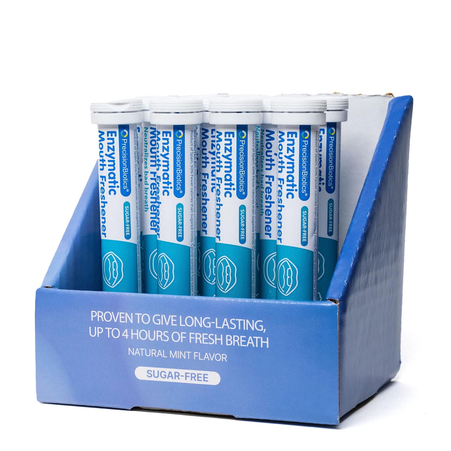 Description: 16 sugar-free breath tablets per 0.8 oz. (24g) tube. Sold as a set of 12 tubes total packed up in a display box. Send your tastebuds on a wintry adventure with PrecisionBiotics Enzymatic Mouth Fresheners—minty fresh, sugar-free breath tablets formulated to awaken your tastebuds and support the elimination of bad breath odor for up to 4 hours.Powered by BioFresh4+ technology, these PrecisionBiotics Enzymatic Mouth Fresheners sugar-free breath tablets work in a unique and innovative way!New science confirms: Removing odor compounds is a highly effective way to neutralize occasional bad breath.Biofilm in your mouth is natural and beneficial for oral health. However, over 1,000 types of bacteria live in this biofilm, some of which produce malodorous compounds. These bacterial compounds release odors that can give you strong-smelling, foul-scented breath. BioFresh4+ technology uses a revolutionary scientific strategy to support capturing and removing these bad breath-causing compounds, effectively supporting the elimination of foul-smelling odors. Combining the forces of nature to produce a new way to tackle occasional bad breath. BioFresh4+ technology is a rapid-acting and highly active odor removal support system. It contains natural enzymes and plant extracts that combine forces to provide immediate support your occasional bad breath for up to 4 hours.Key benefitsPromotes cleaner, fresher breath, and a clean mouth feeling Supports the capture and removal of malodor (bad breath) compounds Quickly supports occasional bad breath with long-lasting effects—up to 4 hours Supports immediate and effective odor neutralization Gets to “hard-to-reach” places like the back of your mouth Proven to neutralize bad breath instantly with bio active Enzymatic and natural plant extract patent pending formula Simple and convenient to use anytime and anywhereIngredients: Sorbitol, xylitol, cellulose, coffee extract, calcium carbonate, natural mint flavor, silicon dioxide, steviol glycosides, enzyme.Serving Size: 1 tableCalories: 4Cautions: Potential choking hazard due to larger than usual tablet size. Supervise children when consuming.Storage Instructions: Store intact in a cool, dry place, away from sunlight.Dosing Instructions: Take 1 tablet as needed up to 5 times daily. For best results, scrub the surface of your tongue with the tablet and let it fully dissolve without chewing. Enjoy fresher breath for up to 4 hours!