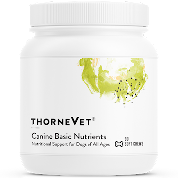 Nutritional Support for Dogs of All AgesCanine Basic Nutrients is a multi-vitamin/mineral supplement for all phases of a dog's life. It offers a complete formula of essential and highly absorbable vitamins and minerals. Because of abundant environmental pollution and the shortcomings of modern processed food, it is difficult to know whether a dog is getting all the basic nutrients it needs for optimal health. By supplying a dog with a multi-vitamin/mineral formula early in its life, and certainly before a dog becomes old or ill, you can enhance the quality and length of the dog's life and optimize its vitality.ThorneVET's Canine Basic Nutrients is intended for use in all phases of a dog's life. It provides a broad range of nutrients, to meet canine needs. The calcium, magnesium, potassium, zinc, copper, and iron in Canine Basic Nutrients are provided in highly absorbable forms. And vitamins B2, B6, B12, and folate are provided in their active, tissue-ready forms.• For use in dogs only. Canine Basic Nutrients contain vitamins and minerals for dogs of all ages.Dietary ConsiderationsGluten FreeServing Size: 1 Piece Servings Per Container: 90Active Ingredients per 2-gram Soft Chew:Calcium (DimaCal DiCalcium Malate) 50 mgd-Alpha Tocopheryl (Vitamin E) (45 IU) 37.3 mgAscorbic Acid (Vitamin C) 25 mgMagnesium (Albion DiMagnesium Malate) 25 mgRiboflavin 5-Phosphate (Vitamin B2) 10 mgCalcium Pantothenate (Vitamin B5) 10.9 mgNiacin 10 mgNiacinamide 10 mgThiamin (Thiamin HCl) 10 mgCholine Citrate 5 mgPyridoxal 5-Phosphate (Vitamin B6) 5 mgInositol 1 mgPotassium (Tripotassium Citrate) 1 mgBeta-Carotene (1,000 IU) 601 mcgZinc (TRAACS Zinc Bisglycinate Chelate) 500 mcgVitamin A Palmitate (500 IU) 275 mcgIron (Ferrochel FerrousBisglycinate Chelate) 250 mcgChromium (as TRAACS Chromium Nicotinate Glycinate Chelate) 20 mcgBiotin 10 mcgCopper (TRAACS Copper Bisglycinate Chelate) 10 mcgFolate (L-5-Methyltetrahydrofolate from L-5-Methyltetrahydrofolic Acid, Glucosamine Salt) 10 mcgMethylcobalamin (Vitamin B12) 10 mcgSelenium (L-Selenomethionine) 10 mcgVitamin K1 5 mcgVitamin D3 (75 IU) 1.9 mcg Inactive ingredients (soft chew matrix): Arabic gum, buffered white distilled vinegar, canola oil, citric acid, guar gum, maltodextrin, natural poultry flavor, rosemary extract, sunflower lecithin, sunflower oil, sweet potato powder, tapioca starch, vegetable glycerin.Directions for use: Dogs: 1 capsule per 25 lbs body weight dailyGluten FreeCautions: Safe use in pregnant animals or animals intended for breeding has not been proven. If animal’s condition worsens or does not improve, stop product administration and consult your veterinarian. Potential for long-term effects.Warnings: For animal use only. Keep out of the reach of children and animals. In case of accidental overdose, contact a health professional immediately.WARNING: Accidental overdose of iron-containing products is a leading cause of fatal poisoning in children under six. Keep this product out of reach of children. In case of accidental overdose, call a doctor or a poison control center immediately.This product uses Albion’s DimaCal DiCalcium Malate. DimaCal is a registered trademark of Albion International, Inc. This product uses Albion DiMagnesium Malate. Albion is a registered trademark of Albion International, Inc. This product uses Albion’s TRAACS Zinc Bisglycinate Chelate, Chromium Nicotinate Glycinate Chelate and Copper Bisglycinate Chelate. TRAACS is a registered trademark of Albion International, Inc. This product uses Albion’s Ferrochel Ferrous Bisglycinate Chelate. Ferrochel is a registered trademark of Albion International, Inc.