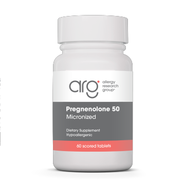 Pregnenolone 50 mg is micronized, plant-sourced pregnenolone formulated in a lipid matrix to bypass the liver, with a particle size of less than 50 microns. Soy free – the source material (wild yam) is non-irradiated and non-ethylene-oxide-treated. Serving Size: 1 Tablet Servings Per Container: 60 Amount Per Serving: Pregnenolone 50 mg Other Ingredients: Micosolle, microcrystalline cellulose, vegetable oil, vegetable wax, Cab-o-sil, magnesium stearate, Vitamin E As a dietary supplement, 1 tablet daily with a meal or as directed by a health care professional. Not for use by individuals under the age of 18 years. Do not use if pregnant or nursing. Consult a physician or licensed qualified health care professional before using this product if you have, or have a family history of, prostate cancer, prostate enlargement, heart disease, low "good" cholesterol (HDL), or if you are using any other dietary supplement, prescription drug, or over-the-counter drug. Do not exceed recommended serving. Exceeding recommended serving may cause serious adverse health effects. Possible side effects include acne, hair loss, hair growth on the face (in women), aggressiveness, irritability, and increased levels of estrogen. Discontinue use and call a physician or licensed qualified health care professional immediately if you experience rapid heartbeat, dizziness, blurred vision, or other similar symptoms. Keep out of reach of children. Keep in a cool, dry place, tightly capped.
