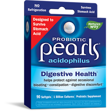 Dietary SupplementConvenient digestive capsule: - One tiny capsule daily - Take anytime - No refrigeration needed Relief from occasional: - gas & bloating - constipation - lactose intolerance Get the goodness of yogurt without the fat, the calories or the spoon! This one-of-a-kind, dairy-free blend of probiotics guarantees delivery of active cultures where you need them. - Contains two vital cultures to increase healthy flora - L. acidophilus and B. longum - Needs no refrigeration, just take one daily - Supports intestinal health; great for everyday, and perfect when you travel! Acidophilus Pearls Start Alive and Stay Alive! Lab tests prove Acidophilus Pearls beat 4 other leading brands in delivering live cultures. Studies show patented Acidophilus Pearls deliver up to 900% more intact microflora to the intestine in relation to label claim than 4 leading competitors, including those with enteric coatings.Dietary ConsiderationsWheat FreeGluten FreeYeast FreeSugar FreePreservative FreeSalt FreeCorn FreeFree of Artificial Colors/FlavorsSodium FreeServing Size: 1 CapsuleServings Per Container: 90Amount Per ServingProprietary Probiotic Blend 1 billion 0 CFULactobacillus acidophilusBifidobacterium longumOther Ingredients:palm oil, gelatin, vegetable glycerin, soy lecithin, pectinRecommendations: One capsule daily, with water or your favorite beverage. May be taken with or without food. Do not chew or crush.If pregnant, nursing, or taking prescription drugs, consult your healthcare practitioner prior to use.Contains no sugar, salt, yeast, wheat, gluten, corn, dairy products, artificial coloring, artificial flavoring, or preservatives. This product contains natural ingredients; color variations are normal.This product has a temper-evident foil pouch. Do not use if foil or pouch is punctured!Store in a cool, dry location. May refrigerate if desired.