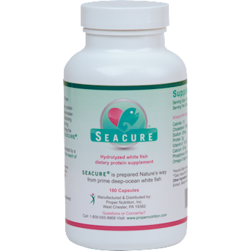 Dietary Supplement Seacure is a pre-digested dietary supplemnent made from the fillets of deep-ocean white fish by means of a unique manufacturing process. The naturally-occuring nutrients found in the fish flesh, including the Omega-3 fatty acids, are retained in Seacure. Seacure is a whole-food based dietary supplement  Serving Size:6 Capsule  Servings Per Container:30  Amount Per Serving% Daily Value Calories10.5 Total Fat0.15 Cholesterol9 mg3% Sodium20 mg1% Protein2 g4% Vitamin A157 IU3% Calcium57 mg6% Phosphorus63 mg6% Omega-332 mg  Other Ingredients: Pacific Whiting (Cod), Rosemary Extract, Gelatin Capsules  Directions: Adults, take six (6) capsules daily or as directed by a healthcare professional.  Note: Consult a physician before using if pregnant or nursing, taking medications or have a medical condition. Use this product as a food supplement only; do not use for weight reduction. Keep out of the reach of children