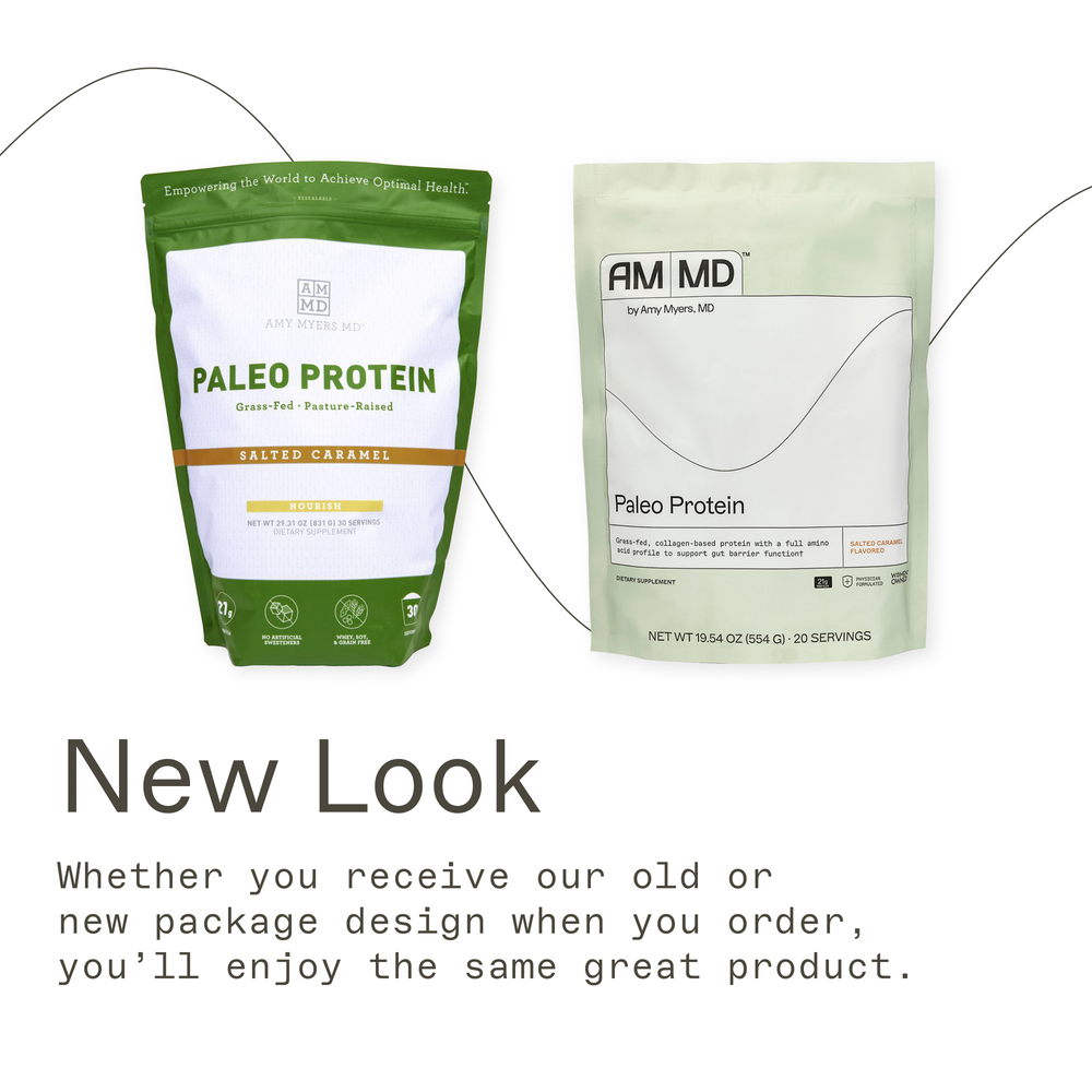 Whether you’re looking to increase your daily protein intake or want to support your gut health, this delicious blend can help you.Grass-fed, collagen-based protein with a full amino acid profile to support gut barrier function†Salted Caramel Paleo Protein is just the right blend of rich caramel and savory sea salt to satisfy your cravings. Even the robust, sweet aroma is enough to send my daughter running into the room every time I open the bag to make a smoothie.How It WorksContains collagen peptides to help support gut barrier function† .Features 21g of high-quality protein per serving.Sourced from grass-fed, pasture-raised bovine, this offering is hydrolyzed for enhanced absorption and easier mixing.Who It’s ForPaleo Protein is essential for those who are invested in supporting their gut health with a formula that enhances absorption, easily and effectively.Key Ingredients:Bovine Collagen Peptides - Collagen is full of amino acids and peptides that help maintain and support healthy hair, skin, nails, joints, and gut health.FAQsWhat is Salted Caramel Paleo Protein made of?Paleo Protein is made from hydrolyzed bovine collagen that comes from happy, pasture-raised cows that graze on fresh green fields in the sunshine. These animals are raised with love and care and are never given unnecessary drugs such as antibiotics, arsenic-based growth promoters, or hormones. They are grass-fed and never fed GMOs, such as genetically modified corn and soy meal.What time of day should I take Salted Caramel Paleo Protein?Paleo Protein is perfect any time of the day. While Dr. Myers likes it in her morning smoothies, you can enjoy it at all times of the day. Whether you’re mixing it into your morning coffee or into shakes for dessert for a flavorful protein boost, you’ll find that it’s great around the clock.Is Salted Caramel Paleo Protein safe for pregnant women, breastfeeding mothers, and children?While many moms and dads tell me they give Paleo Protein to their kids, I always recommend speaking with your child’s pediatrician or nutritionist if you have concerns about any of the ingredients or adjusting the dosing for them. And, as always, I recommend reaching out to your physician, midwife, or other qualified healthcare practitioner if you have any concerns before using it while pregnant or breastfeeding.Is Salted Caramel Paleo Protein damaged by heat?All proteins are damaged by high heat to some extent. Proteins are long chains of amino acids bound together. High heat can potentially fold and warp the amino acid chains into new shapes and structures called amines that may be unusable by the body, or even harmful. This is why you should avoid charring or overcooking meat. The proteins and peptides in my Paleo Protein are quite stable at moderately high temps, so adding it to a hot cup of tea or coffee, or baking it at low temps (below 300F) will not denature it too much.Can I take Salted Caramel Paleo Protein if I’m allergic to tree nuts?Paleo Protein contains MCT oil derived from coconuts. Scientifically speaking, coconuts are not tree nuts—they are in fact fruits classified as a “drupe.” Other drupes include palm fruit, peaches, berries, plums, and apricots. However, because the FDA has lumped coconuts in a group with other tree nuts for labeling purposes, we are required to list them as a potential allergen. In fact, true coconut allergy is actually extremely rare with only a few cases reported in the medical literature. If you have a diagnosed tree nut allergy, please speak with your healthcare provider before consuming any products containing coconut.How come there are fewer scoops in my pouch than the number listed on the label?The listed amount of scoops per pouch is an approximation and can vary based on personal use such as how full you make your scoops, spilling it, how well you scrape out the pouch, etc. While the number listed is an approximation, it shouldn't vary considerably versus what you get.These statements have not been evaluated by the Food and Drug Administration. This product is not intended to diagnose, treat, cure, or prevent any disease. Dietary considerations Gluten free Dairy free Soy free Artificial sweetener free Whey free Grain free Paleo friendly Keto friendly Grass-fed Suggested use Mix 1 scoop in 8 ounces of water or your favorite beverage once per day, or as recommended by your healthcare practitioner. Stir vigorously or shake well. Serving Size: 1 Scoop (approx. 27.7 g) Servings per container: 20 Amount Per Serving Calories ... 100 Total Fat ... 1 g Saturated Fat ... 1 g Total Carbohydrates ... 2 g Dietary Fiber ... 1 g Protein ... 21 g Sodium ... 130 mg Other Ingredients Hydrolyzed bovine collagen, highly refined MCT oil powder (coconut MCT, gum acacia), natural flavor, inulin (chicory root), sea salt, histidine, stevia leaf extract, tryptophan. Warnings Store away from heat and moisture. Make sure bag is tightly sealed. Keep out of reach of children.