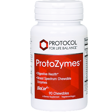 ProtoZymes is a broad spectrum digestive enzyme formulation designed to support optimal breakdown and absorption of proteins, fats, and carbohydrates, including lactose, to ensure maximum nutritional value for you and your children. ProtoZymes has been designed especially for children, but it can also be used by adults to enhance bioaccessibility of nutrients consumed in foods.• Digestive Health• Broad Spectrum Chewable EnzymesDietary ConsiderationsWheat FreeDairy/ Milk FreeVegetarianSoy FreeVeganEgg FreeShellfish FreeFish FreeTree Nut FreeServing Size: 2 WaferServings Per Container: 45Amount Per ServingTotal Carbohydrate 1 gTotal Sugars, less than 1 gBioCore Vegetarian Enzymes 144 mgAmylase (from Aspergillus oryzae) 3500 DUProtease (from Aspergillus oryzae) 21,000 HUTProtease (from Aspergillus oryzae) 4,000 PCLactase (from Aspergillus oryzae) 1,000 ALUGlucoamylase (from Aspergillus niger) 5 AGUProtease (from Aspergillus niger) 50 SAPUInvertase (from Saccharomyces cerevisiae)400 SULipase (from Candida rugosa, Aspergillus niger and Rhizopus oryzae) 500 USP/FIPMalt Diastase (from barley) 1,500 DPProtease (from Aspergillus oryzae) 2 APOther Ingredients:Fructose, Natural Colors, Rice Maltodextrin, Citric Acid, Magnesium Stearate (vegetable source), Beet PowderAdults: Chew 2 tablets with or before each meal. Children (ages 4 & up): Chew 1 tablet with or before each meal. Or use as directed by your healthcare practitioner. Keep lid tightly sealed.Natural color variation may occur in this product.Do Not Eat Freshness Packet. Keep in Bottle.Not manufactured with wheat, soy, milk, egg, fish, shellfish or tree nut ingredients. Produced in a GMP facility that processes other ingredients containing these allergens.
