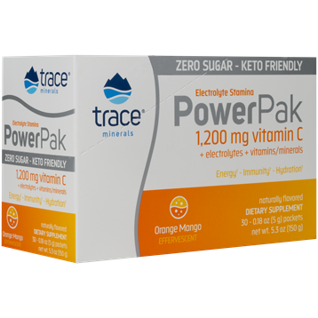 Power Up with PowerPak- Power Pak Electrolyte Packets are an easy-to-fix high performance energy drink with no caffeine, artificial flavors, or artificial stimulants. Each Trace Minerals Power Pak contains all major electrolytes (potassium, magnesium, chloride and sodium), plus a full spectrum of ionic trace minerals from ConcenTrace, which supports the assimilation and absorption of vitamins and nutrients. No Sugar, Great Taste- This tasty, refreshing, and healthy electrolytes drink mix is completely sugar-free, which makes it the perfect keto friendly electrolyte supplement and a great recovery option. Try Trace Minerals delicious Orange-Mango Electrolyte Stamina Power Pak today! Why should I take PowerPak? To help maintain healthy hydration levels and avoid muscle cramps, avoid occasional sluggishness and fatigue, optimize your energy levels, vitality, and a healthy immune system so you can function at your absolute best! So play harder, endure longer and feel replenished with Electrolyte Stamina Power Pak—the right way to revitalize and recharge your body’s natural energy source. Dietary ConsiderationsGluten Free Sugar Free Vegan Non-GMO Serving Size: 1 Packet Servings Per Container: 30 Amount Per Serving % Daily ValueCalories 5 Total Carbohydrate 1 g 1% Vitamin C (as Ascorbic Acid) 1200 mg 1333% Thiamin [Vitamin B1] (as Thiamin HCL) 0.45 mg 38% Niacin (Vitamin B3) 5 mg 31% Vitamin B6 (as Pyridoxine HCL) 10 mg 588% Folate (as 20mcg of Folic Acid) DFE 33 mcg 8% Vitamin B12 (as Cyanocobalamin) 25 mcg 1042% Pantothenic Acid (as d-Calcium Pantothenate) 3 mg 60% Calcium (as Calcium Lactate) 60 mg 5% Magnesium (from Magnesium Oxide, ITM) 100 mg 24% Zinc (as Zinc Oxide) 3 mg 27% Selenium (as Sodium Selenite) 35 mcg 64% Manganese (as Manganese Citrate) 1 mg 43% Chromium (as Chromium Amino Acid Chelate) 10 mcg 29% Chloride (from ITM) 15 mg 1% Sodium (as Sodium Bicarbonate) 75 mg 3% Potassium (from Potassium Citrate, ITM) 200 mg 4% Ionic Trace Minerals (ITM) A concentrated complex of full spectrum ionic trace minerals 100 mg Alpha Lipoic Acid 1 mg Boron (from Boron Amino Acid Chelate, ITM) 175 mcg Other Ingredients: Xylitol, citric acid, natural flavors, malic acid, steviol glycosides, turmeric (Curcuma longa) root extract (color), silicon dioxide Take 1 packet daily. Open packet, mix contents with 2-3 oz. of water & dilute to your taste preference. Additional packets may be taken depending on physical activity. Some caking may occur, but does not affect the quality of the product. No known allergens.