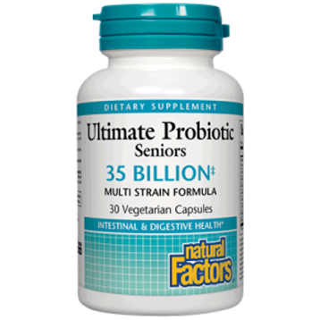 Natural Factors is a leader in probiotic science & innovation with over 35 years' experience. Imbalance in flora may be caused by stress, diet, travel, and gastrointestinal disturbances. Ultimate Probiotic, specifically formulated for seniors, provides a powerful concentration of 35 billion active cells of 8 gastric-resistant strains (at time of expiration) that work synergistically for maximum activity and efficacy.* Supporting a positive balance of microflora helps maintain a healthy immune system and digestive strength. A healthy intestinal flora helps to create a favorable environment for absorption of nutrients.* Enteric coating is not required for all probiotic strains. With regard to stomach acid resistance, not all strains are created equal. Natural Factors has carefully selected naturally acid-resistant strains so that they may be consumed at any time, with or without meals, and are safely delivered to the intestine unharmed. Natural Factors strains are tested for their viability in the stomach to ensure optimal absorption and efficacy. Why choose Natural Factors Ultimate Probiotic Senior’s 35 billion?  Research-supported strains & strengths  Potency guaranteed through expiration  Guaranteed compatibility ensures viability  Bio-support technology for guaranteed acid resistance  Beneficial prebiotic fiber  DNA mapping of each strain for guaranteed identity  Non-GMO  Gluten free  Third-party certified  Dietary Considerations Wheat Free Gluten Free Vegetarian Yeast Free Sugar Free Starch Free Preservative Free Salt Free Corn Free Free of Artificial Colors/Flavors Egg Free Shellfish Free Non-GMO  Serving Size:1 Capsule  Servings Per Container:30  Amount Per Serving  Proprietary Synergistic Blend: Total active cell count 35 billion** Lactobacillus rhamnosus (human) 7 billion** Bifidobacterium breve (human) 5.25 billion** Bifidobacterium longum (human) 5.25 billion** Lactobacillus acidophilus (human) 5.25 billion** Lactobacillus plantarum (vegetal) 5.25 billion** Lactobacillus helveticus (dairy) 3.5 billion** Bifidobacterium bifidum (human) 1.75 billion** Bifidobacterium lactis (dairy) 1.75 billion**  Other Ingredients: Potato starch, FOS (fructooligosaccharides), vegetarian capsule (carbohydrate gum [cellulose],, purified water), magnesium stearate (vegetable grade), silica, ascorbic acid  Suggested usage: 1 capsule 1–3 times per day or as directed by a health professional. For best results take with a meal. Keep out of the reach of children.  May contain traces of milk and soy from fermentation process. Contains no artificial preservatives, color, or sweeteners; no starch, sugar, wheat, gluten, yeast, corn, egg, fish, shellfish, salt, tree nuts, or GMOs. Suitable for vegetarians. Sealed for your protection. Do not use if seal is broken. For freshness, store in a cool, dry place. For maximum potency, refrigerate.