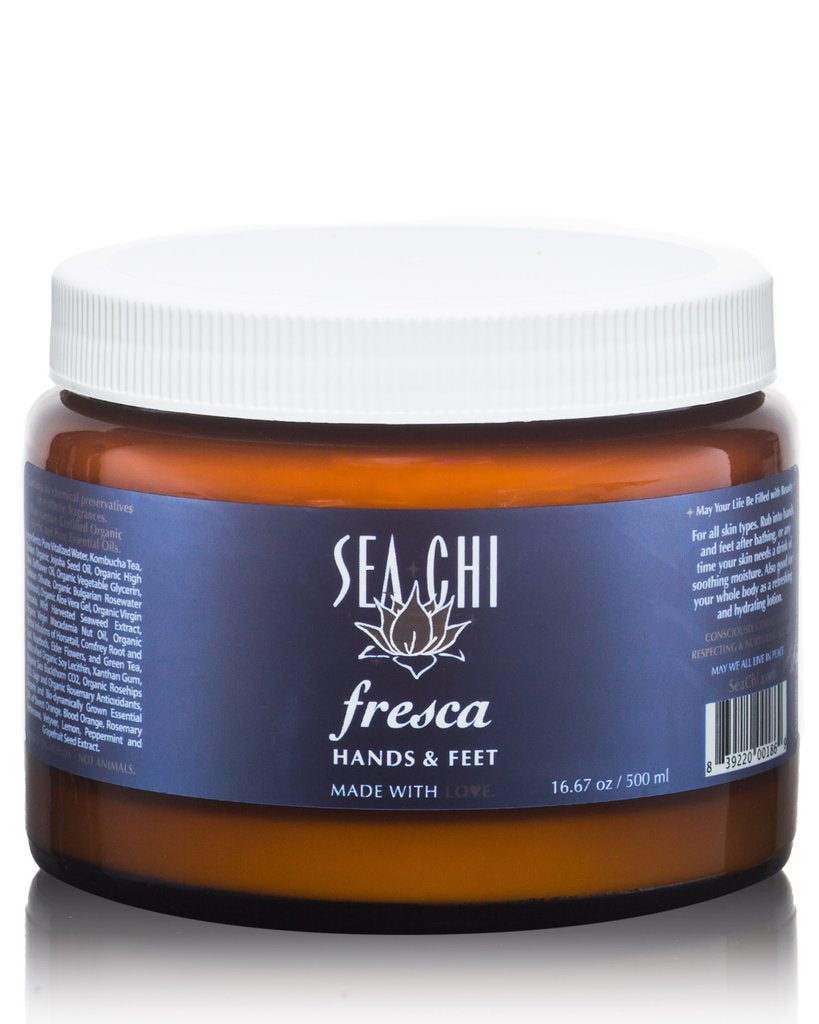 Directions For the Hands and Feet: Fresca works well for all skin types. Rub into hands and feet after bathing, or any time your skin needs a drink of soothing moisture. To enrich your experience, mix with your favorite Sea Chi Body Oil. You can also use Fresca on your whole body as a refreshing and moisturizing lotion. For Massage: Fresca is great for sore, tired feet. Give yourself a quick foot massage (or treat someone else) and your feet will feel invigorated and refreshed. Fresca can also be used for massage on the rest of the body. General Precautions We recommend that you consult with a qualified healthcare practitioner before using herbal products, particularly if you are pregnant, nursing, or on any medications. Persons with allergies should exercise caution. Ingredients Common Name: Pure Vitalized Water, Sorbitan Olivate, Kombucha Tea, Golden Jojoba Seed Oil, High Oleic Safflower Oil, Vegetable Glycerin, Bulgarian Rosewater (Hydrosol), Aloe Vera Gel, Seaweed Extract, Virgin Avocado Oil, Virgin Macadamia Nut Oil, Herbal Infusions of Horsetail, Comfrey Root & Leaf, Rosebuds, Green Tea, & Elder Flowers, Xanthan Gum, Soy Lecithin, Seabuckthorn CO2, Rosehips CO2, Essential Oils of Sweet Orange, Rosemary Verbenone, Vetyver, Lemon & Peppermint, Sage & Rosemary Antioxidants, & Grapefruit Seed Extract International Nomenclature of Cosmetic Ingredients:Aqua (Water), Sorbitan Olivate, Kombucha Tea, Simmondsia Chinensis (Jojoba) Seed Oil, Carthamus Tinctorius (Safflower) Seed Oil, Glycerin, Rosa Damascena Flower Water, Aloe Barbadensis Leaf Juice, Fucus Vesiculosus (Seaweed) Extract, Persea Gratissima (Avocado) Oil, Macadamia Ternifolia Seed Oil, Equisetum Arvense (Horsetail) Extract, Symphytum Officinale (Comfrey) Leaf/Root Extract, Rosa Centifolia Flower Extract, Camellia Sinensis (Green Tea) Extract, Sambucus Nigra (Elder) Flower Extract, Xanthan Gum, Lecithin, Hippophae Rhamnoides (Seabuckthorn) Fruit Extract, Rosa Canina (Rosehip) Fruit Extract, Citrus Sinensis (Sweet Orange) Peel Oil, Rosmarinus Officinalis (Rosemary Verbenone) Leaf Oil, Vetiveria Zizanoides (Vetiver) Oil, Citrus Limon (Lemon) Peel Oil, Mentha Piperita (Peppermint) Oil, Salvia Triloba (Sage) Leaf Extract, Rosmarinus Officinalis (Rosemary) Leaf Extract, Grapefruit Seed ExtractNo GMOs, sodium lauryl or laureth sulfates, petroleum-based products, parabens, phthalates, artificial dyes or synthetic ingredients or fragrances.