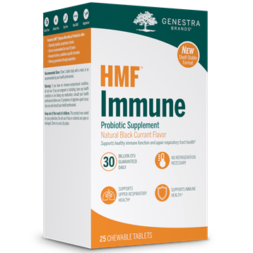 Genestra HMF (Human Microflora) Probiotics offer: Clinically studied, proprietary strains Doctor-recommended for over 20 years Research-driven, condition-specific formulas Potency guaranteed through expiration  Dietary Considerations Dairy/ Milk Free Gluten Free Vegetarian Soy Free Non-GMO  Serving Size: 1 Tablet  Servings Per Container: 25  Amount Per Serving% Daily Value Calories 5 Total Carbohydrate 1 g Vitamin C (as ascorbic acid) 100 mg 111% Vitamin D3 (as cholecalciferol) (1,000 IU) 25 mcg 125% Probiotic Consortium 30 billion CFU Lactobacillus acidophilus (CUL-60 & CUL-21) Bifidobacterium animalis subsp. lactis (CUL-34) Bifidobacterium animalis subsp. lactis (BI-04)  Other Ingredients: Xylitol, black currant fruit extract, sorbitol, natural black currant flavor, silica, magnesium stearate Chew 1 tablet daily with a meal, or as recommended by your health professional. If you have an immune-compromised condition, do not use. If you are pregnant or lactating, have any health condition or are taking any medication, consult your health professional before use. If symptoms of digestive upset occur, stop use and consult your health professional. Keep out of the reach of children. This product was sealed for your protection. Do not use if box or contents are open or damaged. Store in a cool, dry place.
