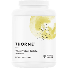 Whey Protein Isolate is ideal for people who need additional protein in their diets from world-class athletes to individuals managing their weight.* It is low in sugar, calories, and fat. Whey Protein Isolate provides 21 grams of protein per serving from an easily assimilated, non-denatured whey source. It features a balanced amino acids profile, including lysine and arginine and the branched-chain amino acids leucine, isoleucine, and valine, which allow the body to be better able to benefit from the protein. Whey Protein Isolate is ideal for anyone who needs additional protein in their diets from world-class athletes to aging adults.*It supports fitness training, weight management, or just maintaining a healthy lifestyle.* Low in sugar, calories, and fat, and easy to digest, Thorne's Whey Protein Isolate contains all the essential amino acids. Its sweeteners and flavorings are derived from natural sources, and it contains no soy. It can be mixed with water or a beverage, or blended into a smoothie or shake. Thorne's Whey Protein Isolate is NSF Certified for Sport.FoundationalSports Performance* Dietary ConsiderationsGluten Free Serving Size: 1 Scoop Servings Per Container: 30 Calories 100Total Fat 0.5 g <1%*Cholesterol 10 mg 3%*Total Carbohydrate 3 g 1%*Dietary Fiber 1 g 4%*Total Sugars 3 g **Includes 1 g Added Sugars 2%*Protein 21 g 42%*Calcium 65 mg 5%Sodium 75 mg 3%Proprietary Blend 30 mg Bromelain **Papain ** Typical Amino Acid Amounts (g) Per Serving:Alanine 1.0Arginine 0.6Aspartic Acid 2.1Cysteine 0.5Glutamic Acid 3.6Glycine 0.4Histidine 0.4Isoleucine 1.2Leucine 2.2Lysine 1.9Methionine 0.5Phenylalanine 0.7Proline 1.2Serine 1.1Threonine 1.4Tryptophan 0.4Tyrosine 0.6Valine 1.2Essential Amino Acid Other Ingredients: Whey Protein Isolate, Flavors, Sunflower Lecithin, Evaporated Cane Juice Sugar, Carboxymethylcellulose Gum, Xanthan Gum, Stevia extract (leaf) (Rebaudioside A 95%). Contains ingredient derived from milk (whey protein isolate). Suggested Use: Mix 1 scoop with at least 8 ounces of water, juice, or preferred beverage daily or as recommended by your health-care practitioner.Gluten FreeIf pregnant, consult your health-care practitioner before using this product.Tamper Evident: Use only if bottle is sealed. Store tightly sealed in a cool, dry place.