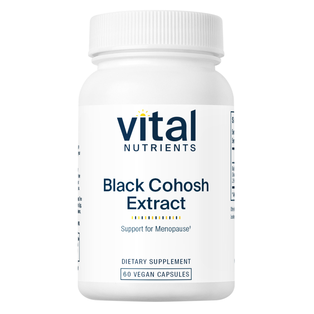 Helps alleviate hot flashes and supports a healthy mood• Relieves common discomforts associated with PMS• Supports well-being• Premium Vegan FormulationBlack Cohosh can be used to support health and well-being before, during and after menopause. It acts as a tonifier and relieves mild mood changes, cramps, and supports a normal, healthy attitude during PMS. It also has been shown to alleviate hot flashes and support a normal, healthy attitude during menopause. Recent research suggests that Black Cohosh does not have phytoestrogenic properties, but instead acts as a partial serotonin receptor agonist to promote healthy serotonin levels.Product packaging may vary. Dietary considerations Gluten free Dairy free Soy free Egg free Milk free Wheat free Casein free Whey free Suggested use Take 1 capsule daily, or as directed by a healthcare practitioner. Serving Size: 1 vegan capsule Servings per container: 60 Amount Per Serving Black Cohosh Extract ... 250mg(Cimicifuga racemosa, root, standardized to 2.5% triterpene glycosides). Other Ingredients Hypromellose, Cellulose, Ascorbic Acid, Leucine, Silica. Free from: Gluten, Dairy, Peanut, Tree Nut, Fish, Shellfish, Soy, Sesame, Egg, Artificial Flavors, Colors, Sweeteners, and Unncessary Excipients. Vegan and Non-GMO Warnings Store sealed in a cool dry place.Keep out of reach of children.Use only if safety seal is intact.If you are pregnant or lactating, taking medication or have a medical condition, consult your healthcare practitioner before use.