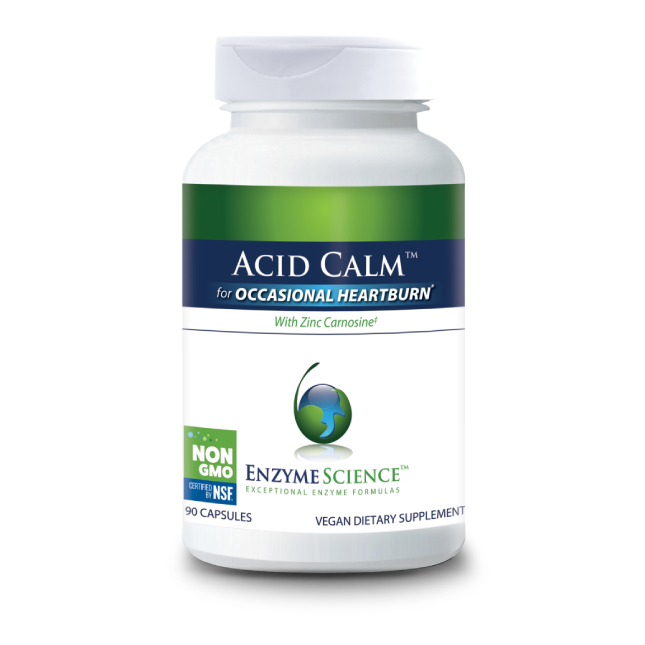 Dietary Supplement Acid Calm contains vegetarian enzymes and botanicals to support digestion and calm symptoms associated with gastrointestinal (GI) distress.' The enzymes in Acid Calm support proper digestion and nurtient absorption, the botanicals offer a natural solution for soothing indigestion, while zinc carnosine provides mucosal lining protection.' Thera-blend enzymes are scientifically designed to provide optimal solutions for digestive health and wellness. These enzymes are comprised of multiple variants which are blended to work synergistically throughout the broad pH range of the human body.  Dietary Considerations Wheat Free Dairy/ Milk Free Gluten Free Soy Free Yeast Free Preservative Free Salt Free Corn Free Free of Artificial Colors/Flavors Egg Free  Serving Size:1 Vegetable Capsule  Servings Per Container:90   Amount Per Serving Zinc (as Zinc Carnosine§) 2 mg 13% Marshmallow root 95 mg  Papaya leaf 95 mg  Gotu Kola (aerial) 48 mg  Amylase Thera-blend 3000 DU  Zinc Carnosine§ 10 mg  Cellulase Thera-b/end CU 600  Lipase Thera-blend 200 USP/FIP   Other ingredients: 100% Vegetarian Capsule (Cellulose,, water)     Recommended Dose: Take 1 capsule at the end of a meal to calm digestive discomfort.' Acid Calm can be taken any lime digestive discomfort begins. Contains no egg, dairy, preservatives, salt, sucrose, soy, wheat, yeast, nuts, corn, gluten, casein, potato, rice, artificial colors or flavors. Vegan. Non-GMO. No Excipients, Binders, or Fillers Keep closed in dry place; avoid excessive heat. Please keep out of reach of children. ÂÂÂÂÂÂ