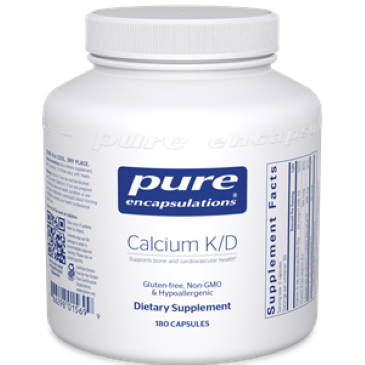 High elemental calcium per capsule with vitamins K and D; supports cardiovascular health and may reduce the risk of osteoporosisCalcium K/D combines di-calcium malate with vitamins D and K for optimal bone support and reduces the risk of osteoporosis. Di-calcium malate provides a high percentage of elemental calcium, fully chelated with the Krebs cycle intermediate malate for optimal absorption. Vitamin D promotes intestinal calcium absorption and reduces urinary calcium loss. A 7-year study involving over 30,000 women indicates that combined calcium and vitamin D supplementation promotes healthy hip bones. Vitamin K enhances bone formation by carboxylating osteocalcin. This enables osteocalcin to bind to calcium and promote healthy bone mineralization. Adequate intake of vitamin K1 and K2 may be especially important for optimal carboxylation in aging individuals. By activating matrix Gla–protein (MGP), vitamin K also helps maintain healthy calcium metabolism in vascular tissues, supporting healthy vascular elasticity.• Supports bone and cardiovascular health • May reduce the risk of osteoporosis • Made with hypoallergenic, vegetarian ingredientsWhen providing adequate calcium throughout life as part of a well balanced diet.  Dietary Considerations Gluten FreeNon-GMO  Serving Size: 2 Vegetable Capsule  Servings Per Container: 90  Amount Per Serving % Daily Value Vitamin D (as cholecalciferol) (D3) (1,000 IU) 25 mcg 125%Vitamin K (as vitamin K1) 100 mcg 83%Calcium (as DimaCal di-calcium malate) 400 mg 31%  Other Ingredients vegetarian capsule (cellulose, water)  Suggested Use As a dietary supplement, take 2 capsules, 1–3 times daily, with meals.  Warning Vitamin K may be contraindicated with Coumadin (Warfarin). If you are pregnant or lactating, have any health condition or are taking any medication, particularly blood thinning medication, consult your health professional before use.Keep out of the reach of children.Use only if safety seal is intact. Store in a cool, dry place.