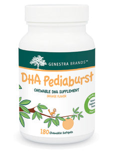 Delicious chewable softgels with a 4.3:1 ratio of DHA to EPA • Supports the development of the brain, eyes, and nerves in children • Promotes optimal cognitive health and brain function • Provides 260 mg of DHA and 60 mg of EPA per day • Delivers a clean, naturally sweetened orange flavor with no fishy aftertaste or odor DHA Pediaburst is a chewable softgel supplement that is suitable for children ages four and older. It provides a great alternative for children that have difficulty swallowing capsules. Studies indicate that daily dosages of 150 mg or more of DHA may help promote healthy development of the brain, eyes, and nerve tissue in children up to 12 years of age. Research suggests that supplementation of 100 mg/ day of DHA helps to support cognitive health and brain function.  Dietary Considerations Wheat Free Dairy/ Milk Free Gluten Free Yeast Free Sugar Free Free of Artificial Colors/Flavors Sodium Free  Serving Size: 2 Capsule  Servings Per Container: 90  Amount Per Serving Calories5 Cholesterol10 g Vitamin E (d-alpha tocopherol)5 IU Fish Oil (Tuna)500 mg Yielding DHA (Docosahexaenoic Acid)130 mg EPA (Eicosapentaenoic Acid)30 mg Stevia (Stevia rebaudiana) Leaf Std. Extract (90% Steviosides)1 mg  Other Ingredients Gelatin, glycerin, natural orange flavor, purified water, modified corn starch (non-GMO), annatto extract  Suggested Use Adults and Children (4 years and older): Chew two softgels two times daily with meals, or as recommended by your healthcare practitioner.  Warning Guaranteed to contain no added wheat, yeast, gluten, sodium, sugar, artificial flavoring, antimicrobial preservatives or dairy products.  Quality Assurance Safety-sealed for your protection and for product freshness. Do not use if inner seal is missing or broken. Store in a cool, dry place. Keep out of reach of children.