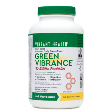 Description Packed with micronutrients and designed to support the four foundations of health; nutrition, circulation, digestion and immunity.* Green Vibrance is your convenient, comprehensive nutrition solution. Available in powder and capsules. Supports digestion and immune health Provides nutrition from nutrient-dense, concentrated whole foods Improves circulation to help deliver trace nutrients to each cell of the body* Green Vibrance has lead the way in the green superfoods industry and has won an impressive number of awards since its launch in 1992. It's a comprehensive green superfood that focuses on the four foundations of whole-body wellness: nutrition, circulation, digestion, and immunity.* Green Vibrance is loaded with ingredients that support these areas, including 25 billion probiotics, prebiotics, digestive enzymes, oat grass, goji berries, astragalus, holy basil, flaxseed powder, and so much more.  Dietary Considerations Gluten Free Vegetarian Non-GMO  Suggested Use As a dietary supplement, take 16 Vegicaps per day in single or divided doses.  Amount Per Serving Calories45 Total Fat1 g Total Carbohydrate9 g Dietary Fiber3 g Total Sugars2 g Protein3 g Vitamin A (from beta-carotene)1.25 mg (4,157 i.u.) Vitamin C50 mg Calcium57 mg Iron2 mg Vitamin D3 (from lichen oil) (1,000 i.u.)25 mcg Vitamin E (water dispersible-alpha-tocopheryl acetate) (100 i.u.)67 mg Vitamin K47 mcg Vitamin B6122 mcg Iodine154 mcg Magnesium38 mg Selenium46 mcg Chromium80 mcg Sodium40 mg Potassium240 mg Cereal Grasses Barley grass leaf powder certified organic800 mg Oat grass leaf powder certified organic800 mg Wheat grass leaf powder certified organic800 mg Barley grass juice powder certified organic130 mg Oat grass juice powder certified organic120 mg Wheat grass juice powder certified organic130 mg Kamut grass juice powder certified organic90 mg Plant Based Micro-Nutrition Chlorella cracked soft cell powder1000 mg Sunflower lecithin powder Non-GMO700 mg Spirulina powder certified organic500 mg Beet root juice powder freeze dried certified organic300 mg Parsley leaf stem powder certified organic300 mg Zucchini (Cucurbita pepo) fruit powder250 mg Alfalfa sprouts powder freeze dried certified organic200 mg Carrot root powder certified organic200 mg Spinach leaf powder certified organic150 mg Green bean powder120 mg Broccoli sprouts freeze dried powder certified organic100 mg Ascophyllum nodosum seaweed pdr certified organic100 mg Moringa oleifera 0.1% Chromium ext. certified organic Orgen-Cm80 mg Kale sprouts powder freeze dried certified organic50 mg Policosanol 60% octocosanol from sugar cane wax std. extract5 mg Antioxidant Life Preservers Tomato fruit powder400 mg Strawberry fruit powder250 mg Acerola fruit juice 21% natural vit. C cert. organic std. ext200 mg Amla whole fruit powder150 mg Apricot fruit powder150 mg Goji berry juice powder certified organic150 mg Water dispersible Vitamin E d-alpha tocopheryl acetate143 mg Ginkgo biloba 24% ginkgoflavonglycosides 6% terpene lactones std. ext20 mg Grape seed 95% polyphenols/40% OPCs standardized extract20 mg Grape skin 30% polyphenols standardized extract20 mg Green tea 98% polyphenols/80% catechins/50% EGCG std. ext. decaf.20 mg Pomegranate whole fruit 40% ellagic acid standardized extract20 mg Black mustard seed 0.5% Selenium ext. cert. org. Orgen-SE®10 mg Immune Support Astragalus 70% polysaccharides standardized extract90 mg Beta 1,3-1,6 glucans 70% standardized extract from Saccharomyces cerevisiae yeast30 mg Larch arabinogalactans extract ResistAid30 mg Adaptogens Eleutherococcus senticosus root 0.8% eleutherosides std. ext.100 mg Holy basil 2% ursolic acid standardized extract100 mg Suma (Pfaffia paniculata) root powder60 mg Skeletal Support Cissus Quandrangularis 86% oligofructose+inulin std. ext.400 mg Calcium Fructoborate providing 3 mg boron112 mg Vitashine lichen oil powder supplying 1000 i.u. Vitamin D3 Cholecalciferol10 mg Fiber Acacia gum fiber certified organic830 mg Fructo-oligosaccharides 86% oligofructose+inulin standardized extract600 mg Apple fruit powder certified organic400 mg Flaxseed powder de-oiled Non-GMO certified organic300 mg Liver Support Burdock root 10:1 extract90 mg Silamarina Milk Thistle extract60 mg Dandelion root 4:1 extract50 mg Enzymes & Tonics Ginger root powder certified organic20 mg Enzyme Blend10 mg Protease 4.5 (Aspergillus oryzae)500 HUT* Protease 6.0 (Aspergillus oryzae)400 HUT* Lipase (Aspergillus niger)300 FIP* Amylase (Aspergillus oryzae)400 DU* Invertase (Saccharomyces cerevisiae)75 SU* Cellulase (Trichoderma longbrachiatum)500 CU* Cayenne pepper powder certified organic2 mg Probiotics (25B at Date of Manufacture from 12 Strains) Bifidobacterium breve HA-1292.5 billion* Bifidobacterium longum HA-1352.5 billion* Lactobacillus acidophilus HA-1222.5 billion* Lactobacillus rhamnosus HA-1112.5 billion* Lactobacillus rhamnosus B HA-1142.5 billion* Lactobacillus paracasei HA-1082.5 billion* Lactobacillus plantarum HA-1192.5 billion* Lactococcus lactis HA-1362.5 billion* Propionibacterium shermanii HA-1822.5 billion* Bifidobacterium bifidum HA-1321.25 billion* Streptococcus thermophilus HA-1100.75 billion* Lactobacillus helveticus HA-1280.5 billion*  Other Ingredients: Vanifolia natural flavor (35mg), vegetable cellulose capsule Warnings Gluten Free. Vegetarian. Plant-Based. NonGMO. Contains: milk, soy. Trace amounts of milk and soy residues were detected as byproducts of the probiotic growth cycle.ÂÂ