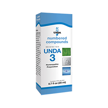 Homeopathic. UNDA Numbered Compounds are unique remedies synergistically formulated with plant constituents that target and carry potentized metals to specific organs where enzymatic and metabolic functions are carried out on a cellular level helping to facilitate the drainage of toxins.†UNDA Numbered Compounds are the only complex remedies of their type, formulated with both plants and metals, acting on organotropic and energetic sensitivity levels respectively. Each remedy has its own fingerprint and is combined synergistically based on the integrated principles and theories of anthroposophy, oligotherapy, botany, Traditional Chinese Medicine and homeopathy. UNDA Numbered Compounds are key in Biotherapeutic Drainage as they work on a physiological and terrain level, making them an excellent addition to practitioners prevention and treatment armamentarium.†Established over half a century ago in Belgium, UNDA is renowned for manufacturing exceptional homeopathic products utilized in supporting immune, lymphatic and endocrine systems. In the production of all homeopathic remedies UNDA uses only pure materials and herbs that are biodynamically grown or wildcrafted. UNDA produces a broad range of homeopathic products in various potencies including: the unique Numbered Compounds, Gemmotherapy macerates, Schuessler Tissue Salts, Gammadyn Oligo-Elements, Organotherapy, Plexes, creams and oils, as well as homeopathic compatible dental care. Formula  Each Drop Contains Equal Parts of: Rubus fruticosus Leaf . . . . . . . . . . . 4X Spongia tosta (Roasted sponge) . . . 4X Calendula officinalis (Marigold) Flowering Tops . . . . . . . . . . . . . . . 4X Drosera (Sundew) Whole Plant. . . . . 4X  Inactive Ingredients: Ethanol (beet), purified water  Directions Adults and Children (12 years and older): Take 10 to 30 drops one to three times daily, or as recommended by your healthcare practitioner. Children (6-11 years): Take 5 to 15 drops one to three times daily, or as recommended by your healthcare practitioner. Children (1-5 years): Take 5 to 10 drops one to three times daily, or as recommended by your healthcare practitioner. Infants (0-11 months): Take 1 to 5 drops one to three times daily, or as recommended by your healthcare practitioner. Acute Dosing: Follow the above age recommended drop amounts and take every 15 to 60 minutes (up to 12 times per day) or until symptoms improve, then resume general dosing. Contains 31% Alcohol Warnings If pregnant or breastfeeding, ask a health professional before use. Keep out of reach of children. In case of overdose, get medical help or contact a Poison Control Center right away. If symptoms persist or worsen, consult your healthcare practitioner.