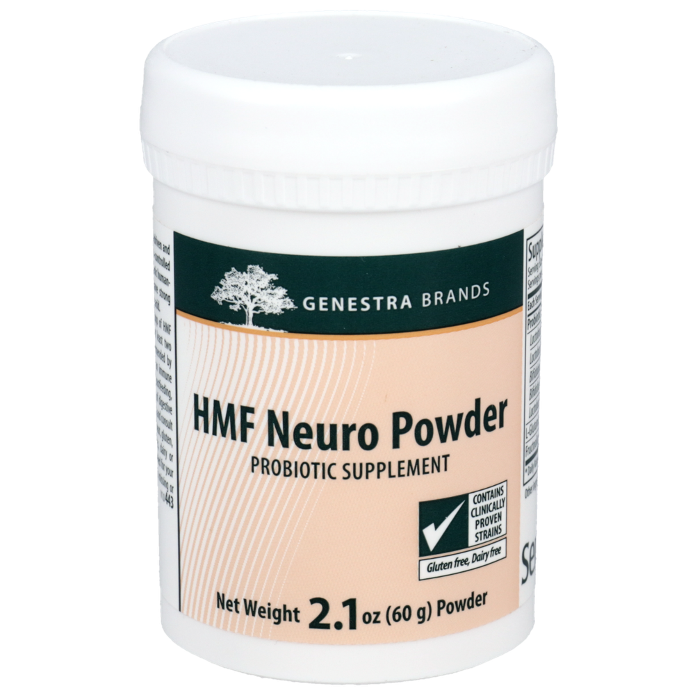 Supports a healthy gastrointestinal tract and microflora• Contains L. rhamnosus, a probiotic that has shown exorphin-degrading activity in vitro• Provides 24 billion CFU per daily dose• Includes 1000 mg of L-glutamine and 500 mg of fructooligosaccharides (FOS) per daily dose• Great-tasting apricot flavorHMF Neuro Powder provides a combination of five proprietary, human-sourced probiotics, plus the amino acid L-glutamine and FOS in a delicious apricot-flavored powder. This probiotic blend includes L. rhamnosus, a strain that has demonstrated exorphin-degrading activity in vitro. Exorphins are peptides produced during the digestion of certain foods, including wheat and dairy products. In intestinally-stimulated conditions, L. rhamnosus has been shown to extensively eliminate exorphins from wheat and milk. This probiotic helps to support gastrointestinal health and contribute to a favorable gut flora along with four other proprietary, research-driven strains.  Dietary considerations Gluten free Dairy free Milk free  Suggested use Adult Dose: In a glass, add water to one scoop of HMF Neuro Powder and mix. Take two times daily with meals, at least two to three hours before or after taking antibiotics, or as recommended by your healthcare practitioner.  Serving Size: 1 Scoop (1 g)  Servings per container: 60  Amount Per Serving Probiotic Consortium ... 12 billion CFU Lactobacillus acidophilus (CUL-60) Lactobacillus acidophilus (CUL-21) Bifidobacterium bifidum (CUL-20) Bifidobacterium animalis subsp. lactis (CUL-34) Lactobacillus rhamnosus (CUL-63) L-Glutamine ... 500mg Fructooligosaccharides ... 250mg (FOS)  Other Ingredients Apricot powder Guaranteed to contain no added wheat, gluten, soy, artificial coloring or flavoring, antimicrobial preservatives, dairy or animal products. Ideal for vegans. Warnings Risk Information: If you have an immune-compromised condition, do not use. If you are pregnant or breastfeeding, consult your healthcare practitioner prior to use. If symptoms of digestive upset occur, worsen or persist beyond three days, discontinue use and consult your healthcare practitioner. Guaranteed to contain no added wheat, starch, sodium, artificial coloring or flavoring or antimicrobial preservatives.Ideal for vegans.Quality Assurance: Safety-sealed for your protection and for product freshness. Do not use if outer seal is missing or broken. Store under refrigeration (below 46° F).
