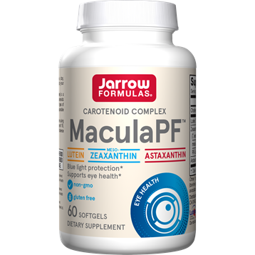"Jarrow Formulas MaculaPF (Protective Factors) is a synergistic combination of three key antioxidant carotenoids to support the eyes’ maculae in blue light from all types of screens, LED lighting, and sunlight. The macula is responsible for focus and color"  Dietary Considerations Wheat Free Dairy/ Milk Free Gluten Free Soy Free Egg Free Shellfish Free Fish Free Tree Nut Free Peanut Free  Suggested Use Usage: Take 1 softgel per day, preferably with a fat-containing meal, or as directed by your qualified healthcare professional.  Serving Size: 1 SoftGel  Servings Per Container: 60  Amount Per Serving Choline (from Sunflower Lecithin) 10 mg Lutein (T. erecta) (Marigold) (Petal) 20 mg Zeaxanthin (T. erecta) (Marigold) (Petal) 13 mg meso-Zeaxanthin 9 mg RR-Zeaxanthin 4 mg Astaxanthin (from H. pluvialis) 4 mg  Other Ingredients Sunflower lecithin, softgel (bovine gelatin, water, glycerin, caramel [color]), avocado oil, sunflower oil  Warnings Keep out of reach of children.Storage: Store in a cool, dry place. Short Shelf Life: Item has a short shelf life of 6 months or less.