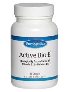 Active Bio-B 60 caps  Dietary Supplement Biologically Active Forms of Vitamin B12 – Folate – B6 Serving Size: 1 Capsule Servings per Container: 60 Amount per Serving Vitamin B6 25 mg (from pyridoxal-5-phosphate) Folate 800 mcg (as (6S)-5-methylfolate) (equivalent to 1,600 mcg of (6S)-5-Methyltetrahydrofolic acid, glucosamine salt) Vitamin B12 (as methylcobalamin) 1,000 mcg Other Ingredients rice flour, vegetable cellulose and vegetable magnesium stearate. Contains no sugar, salt, yeast, wheat, gluten, corn, soy, dairy products, artificial coloring, artificial flavoring, or preservatives. Warning If pregnant or nursing, consult a health care practitioner before using. These statements have not been evaluated by the Food and Drug Administration. This product is not intended to diagnose, treat, cure or prevent any disease.