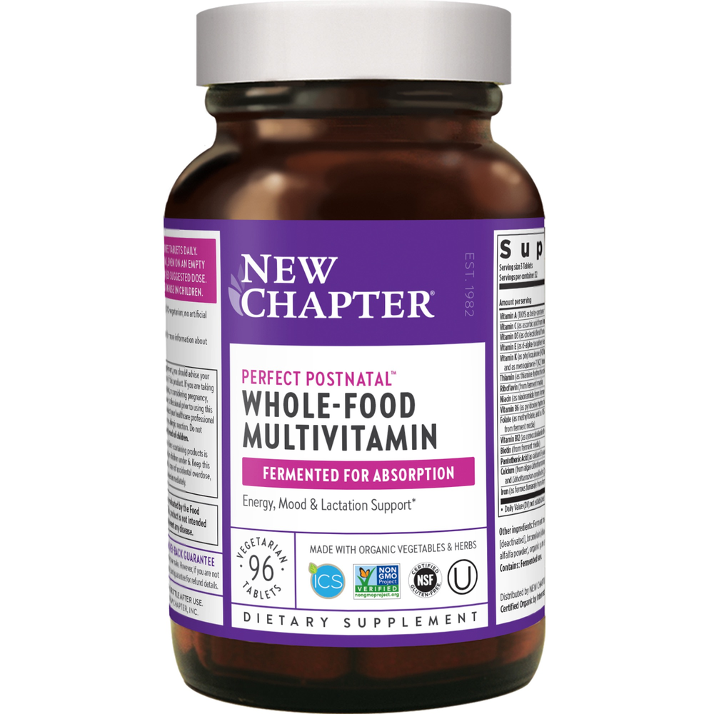 Your baby is born, and your world is changing in incredible ways. As you begin this new journey together, New Chapter will help take care of you as you care for your new baby. Our unique 3-in-1 multivitamin + multimineral + multiherbal probiotic-fermented formula is made especially to give busy moms consistent nutritional support, and includes lactation support for nursing moms. You can rest easy knowing your postnatal vitamin is made with organic, Non-GMO ingredients. Because ingredients matter. These statements have not been evaluated by the Food and Drug Administration. This product is not intended to diagnose, treat, cure or prevent any disease.Dietary ConsiderationsGluten FreeVegetarianOrganicFree of Artificial Colors/FlavorsEgg FreeNon-GMOServing Size: 3 TabletServings Per Container: 32Amount Per Serving % Daily ValueVitamin A (100% as beta-carotene from ferment media) 1300 mcg 100%Vitamin C (as ascorbic acid from ferment media) 75 mg 63%Vitamin D3 (as cholecalciferol from ferment media) Vitamin D3 (as cholecalciferol from ferment media) 50 mcg 333%Vitamin E (as d-alpha-tocopheryl acetate from ferment media) 20.9 mg 110%Vitamin K (as phylloquinone [K1] from ferment media and as menaquinone-7 [K2] from natto) 90 mcg 98%Thiamin (as thiamine hydrochloride from ferment media) 1.4 mg 100%Riboflavin (from ferment media) 1.6 mg 100%Niacin (as niacinamide from ferment media) 18 mg 100%Vitamin B6 (as pyridoxine hydrochloride from ferment media) 10 mg 500%Folate (as methylfolate, and as 105 mcg folic acid from ferment media) DFE 540 mcg 90%Vitamin B12 (as cyanocobalamin from ferment media) 3 mcg 107%Biotin (from ferment media) 35 mcg 100%Pantothenic Acid (as calcium D-pantothenate from ferment media) 7 mg 100%Calcium (from algae Lithothamnion [Lithothamnion calcareum and Lithothamnion corallioides]) 75 mg 6%Iron (as ferrous fumarate from ferment media) 18 mg 67%Iodine (60% as potassium iodide from ferment media and 40% from kelp) 150 mcg 52%Magnesium (as magnesium oxide from ferment media and from algae Lithothamnion [Lithothamnion calcareum and Lithothamnion corallioides]) 20 mg 5%Zinc (as zinc oxide from ferment media) 10 mg 77%Selenium (as selenium dioxide from ferment media) 70 mcg 100%Copper (as copper sulfate anhydrous from ferment media) 1 mg 77%Manganese (as manganese chloride from ferment media) 2.6 mg 100%Chromium (as chromium chloride from ferment media) 45 mcg 100%Molybdenum (as sodium molybdate from ferment media) 20 mcg 40%Postnatal Herbal Blend (from ferment media) 265 mgOrganic OatsOrganic Lemon Balm (leaf)Organic Chamomile (aerial parts)Organic Lavender (flowers)Organic Cardamom (seed)Organic Kelp (Ascophyllum nodosum) (thallus) 90 mgOrganic Nigella (Nigella sativa) (seed) 40 mgOrganic Turmeric (rhizome) 27.2 mg from ferment media and 8 mg from supercritical extract 35.2 mgOther Ingredients: organic gum acacia, silica, magnesium stearate, lac resin and carnauba waxSuggested use: Three tablets daily. Can be taken anytime, even on an empty stomach. Do not exceed suggested dose. Not recommended for use in children.Contains: Fermented soy and fermented wheat (as food source for Saccharomyces cerevisiae).GLUTEN FREE VERIFIED NON-GMO *ICS CERTIFIED ORGANICCaution: As with any dietary supplement, you should advise your healthcare professional of the use of this product. If you are nursing, pregnant, or considering pregnancy, you should consult your healthcare professional prior to using this product. Do not use if taking anti-coagulants. Discontinue use and contact your healthcare professional if you experience a side effect or an allergic reaction. Read ingredients carefully and avoid use if known sensitivity to any of the ingredients. Do not combine with other products containing Vitamin D. Keep out of reach of children. Warning: Accidental overdose of iron-containing products is a leading cause of fatal poisoning in children under 6. Keep this product out of reach of children. In case of accidental overdose, call a doctor or poison control center immediately.